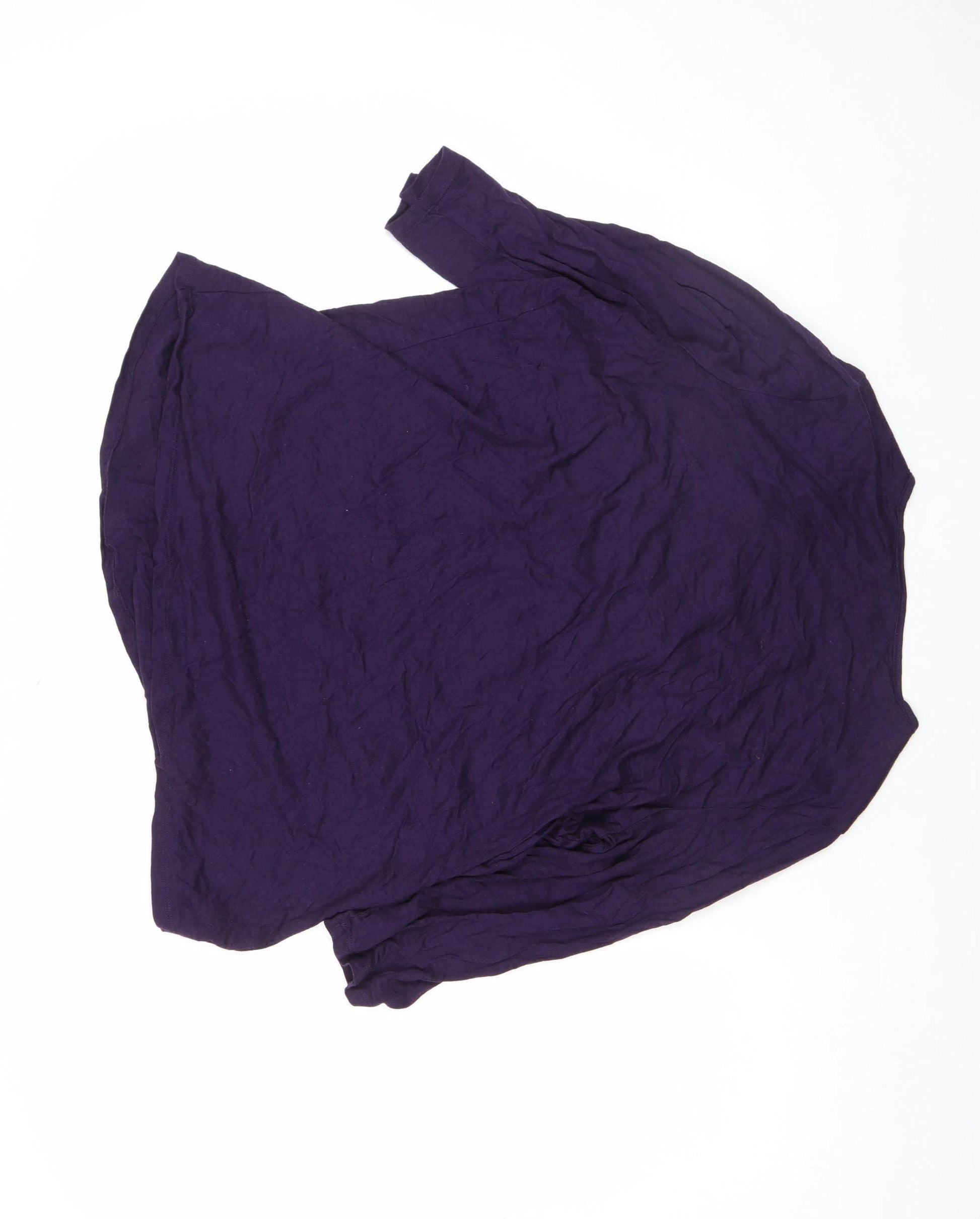 Add a touch of understated glamour to your everyday wardrobe with this Marks and Spencer women’s purple tunic top. Crafted from a blend of viscose, cotton, and a luxuriously soft silk-trim detail, it offers a lightweight and comfortable feel against the skin. This easy-to-wear piece features a scoop neckline embellished with metallic stud accents that catch the light beautifully, giving a flattering and stylish finish. The 3/4 length sleeves make it ideal for layering or transitional seasons such as autumn and spring. Designed in a solid, deep purple shade, this top offers a sophisticated pop of colour that flatters a range of skin tones and pairs effortlessly with jeans, trousers, or skirts. The regular fit ensures comfort without compromising on style, while the pullover design provides easy wearability. Made by Marks and Spencer, a trusted British brand known for quality and style, this tunic embodies both elegance and practicality. Perfect for casual days out, social gatherings, or relaxed party occasions, it’s a versatile addition to any wardrobe. Whether teamed with denim for a laid-back look or accessorised with statement jewellery for evening wear, this studded tunic top ensures you step out with confidence. Conditioned in very good pre-loved state with some light creasing from storage, it remains in excellent wearable condition. Machine washable for ease of care, this garment retains its softness and shape wash after wash. Designed to both flatter and endure, this Marks and Spencer purple tunic is a wonderful choice for women seeking comfort with a modern twist.