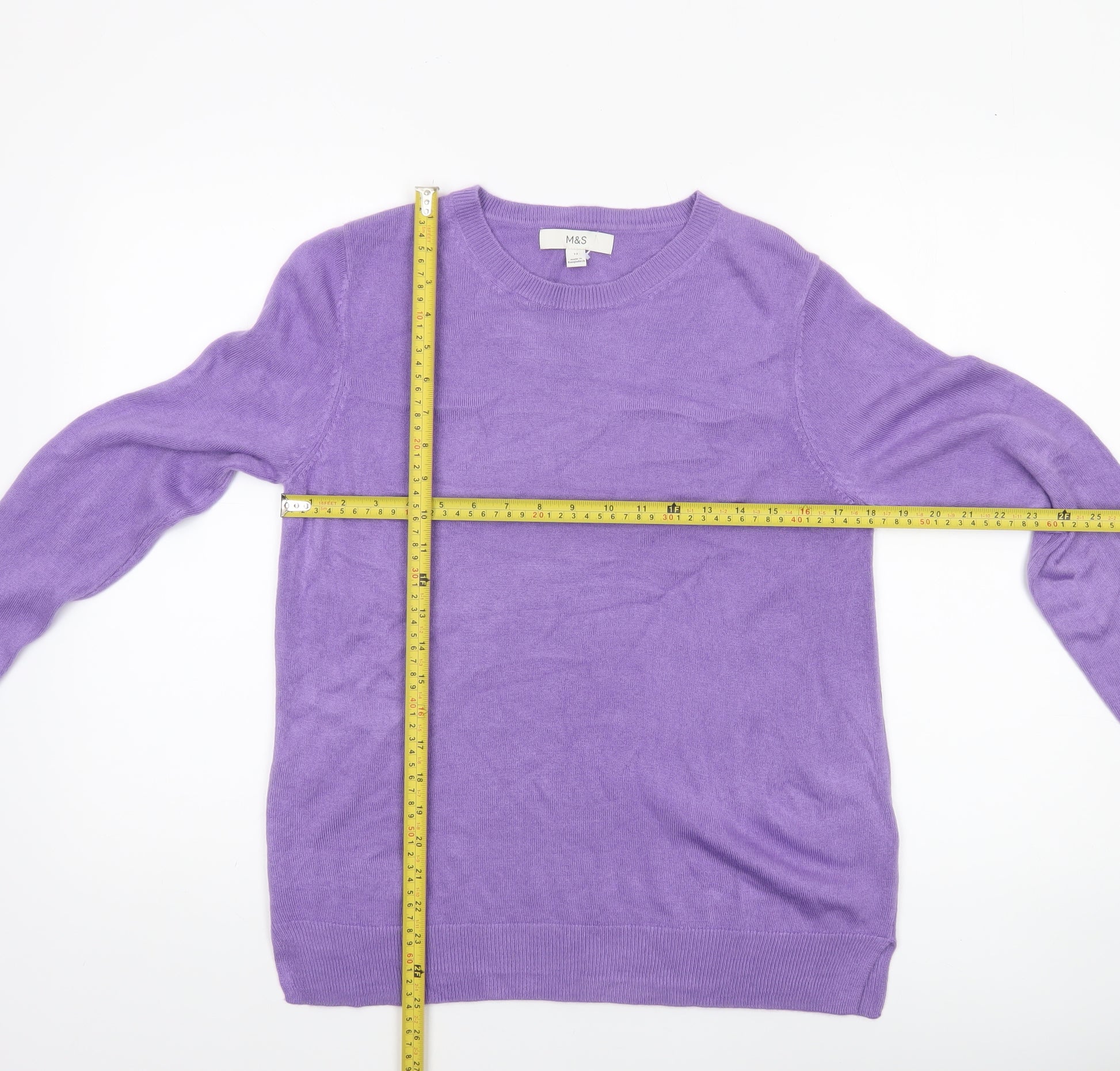 Step into classic comfort with this elegant Marks and Spencer women’s jumper in a soft, cheerful purple shade. Crafted entirely from acrylic, this jumper provides warmth while remaining lightweight and breathable—ideal for all-season styling. The fine knit fabric ensures a smooth, sleek finish, making it a versatile piece for both casual and semi-formal attire. Designed in a timeless crew neck shape with ribbed trims at the cuffs and hem, it fits beautifully without being restrictive, flattering a regular UK size 12 silhouette.This long sleeve pullover is an effortlessly chic layering option, perfect for transitioning between cooler evenings and crisp mornings. Its simplicity allows endless outfit combinations—pair it with tailored trousers for a professional yet cosy look, or wear it casually with jeans and ankle boots. The high-quality construction showcases Marks and Spencer’s commitment to durability and comfort, ensuring a soft touch against the skin and easy maintenance through gentle machine washing.Whether you’re heading to work, spending the day at home, or grabbing coffee with friends, this purple jumper provides both style and functionality. The minimalist design offers understated elegance, while the bold lavender tone adds a touch of modern vibrancy to any wardrobe. Ideal for the autumn, winter, and early spring months, it’s a wardrobe staple that keeps you stylishly snug throughout the seasons.In excellent pre-loved condition, this jumper shows light signs of wear but no flaws, maintaining its rich colour and shape. A timeless and affordable addition, this Marks and Spencer crew neck pullover is a sure favourite for women who value comfort, quality, and effortless fashion.
