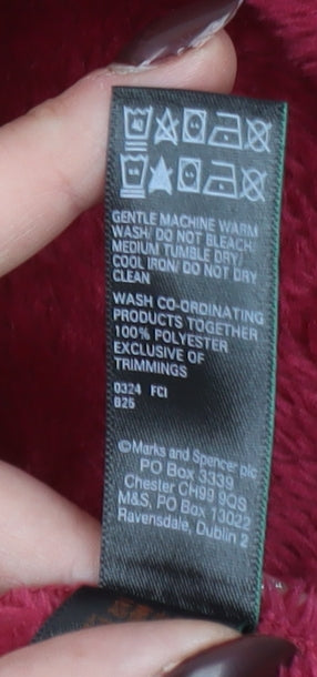 Wrap yourself in luxurious comfort with this beautifully soft red fleece robe from Marks and Spencer's Rosie collection. Designed exclusively for M&S, this robe is perfect for women who value both elegance and warmth in their nightwear. Crafted from 100% polyester fleece, it delivers a plush, snuggly feel that keeps you cosy on chilly evenings. The deep red hue, listed as 'Claret', adds a touch of sophistication while the soft, velvety texture brings a hint of luxury to your bedtime or lounging routine. Featuring a generous hood, long sleeves, and a self-tie belt at the waist, this robe ensures a comfortable and adjustable fit. The fabric drapes beautifully, while its lightweight yet insulating construction makes it perfect for winter nights or cool mornings. The tie closure offers flexibility and convenience, while two handy side pockets provide practicality without compromising on style. Designed in a versatile size Small with a regular fit, this robe makes a flattering addition to any loungewear collection. Ideal for cosy nights at home, lazy Sunday mornings, or curling up with a book, this Marks and Spencer fleece robe combines quality craftsmanship with timeless design. It’s an excellent choice for those who appreciate premium nightwear with a touch of indulgence. Easy to care for, it’s fully machine washable for simple maintenance. In excellent pre-owned condition, this piece shows minimal signs of wear and has been well maintained. Offering exceptional comfort and understated sophistication, this Marks and Spencer hooded fleece robe is sure to become your go-to for ultimate relaxation and warmth. Priced affordably for high-quality women’s nightwear, it’s the perfect gift for yourself or a loved one who enjoys stylish, soft-touch loungewear that feels as good as it looks.