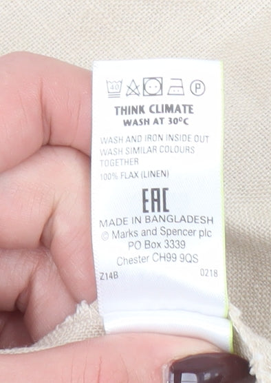 Step into effortless summer style with these lovely Marks and Spencer women’s beige linen capri trousers in UK size 12 Short. Crafted from 100% pure linen, these trousers combine breathable comfort with a naturally lightweight feel, making them a perfect choice for warm-weather days. Linen offers a relaxed texture that keeps you cool while maintaining a refined appearance, ideal for holidays, casual outings, or everyday wear. The timeless beige tone ensures exceptional versatility, easily complementing an array of tops and footwear, from breezy blouses to casual tees and sandals.Designed with practicality and comfort in mind, these trousers feature a part-elasticated waistband providing a flexible fit, while the zip and button closure ensure ease of wear. Handy front and rear pockets add a touch of utility, perfect for holding small essentials while maintaining a clean and stylish silhouette. The straight-cut leg and short length create a flattering shape that keeps the look tailored yet relaxed.These Marks and Spencer trousers embody laidback elegance — effortlessly chic whether you’re sightseeing on a summer getaway, strolling through town, or enjoying relaxed weekends at home. Their crease-prone texture is a natural characteristic of linen, adding to their charm and casual appeal. The breathable fabric also ensures you stay comfortable throughout spring and summer, providing a natural drape that flatters most body shapes.In excellent pre-loved condition, these trousers show only minimal signs of previous wear, with slight wrinkling consistent with linen texture. They are freshly laundered and ready for immediate wear. Perfect for creating polished yet easygoing looks, these beige linen trousers are a versatile addition to any woman’s wardrobe, delivering enduring quality and effortless comfort at an outstanding value.