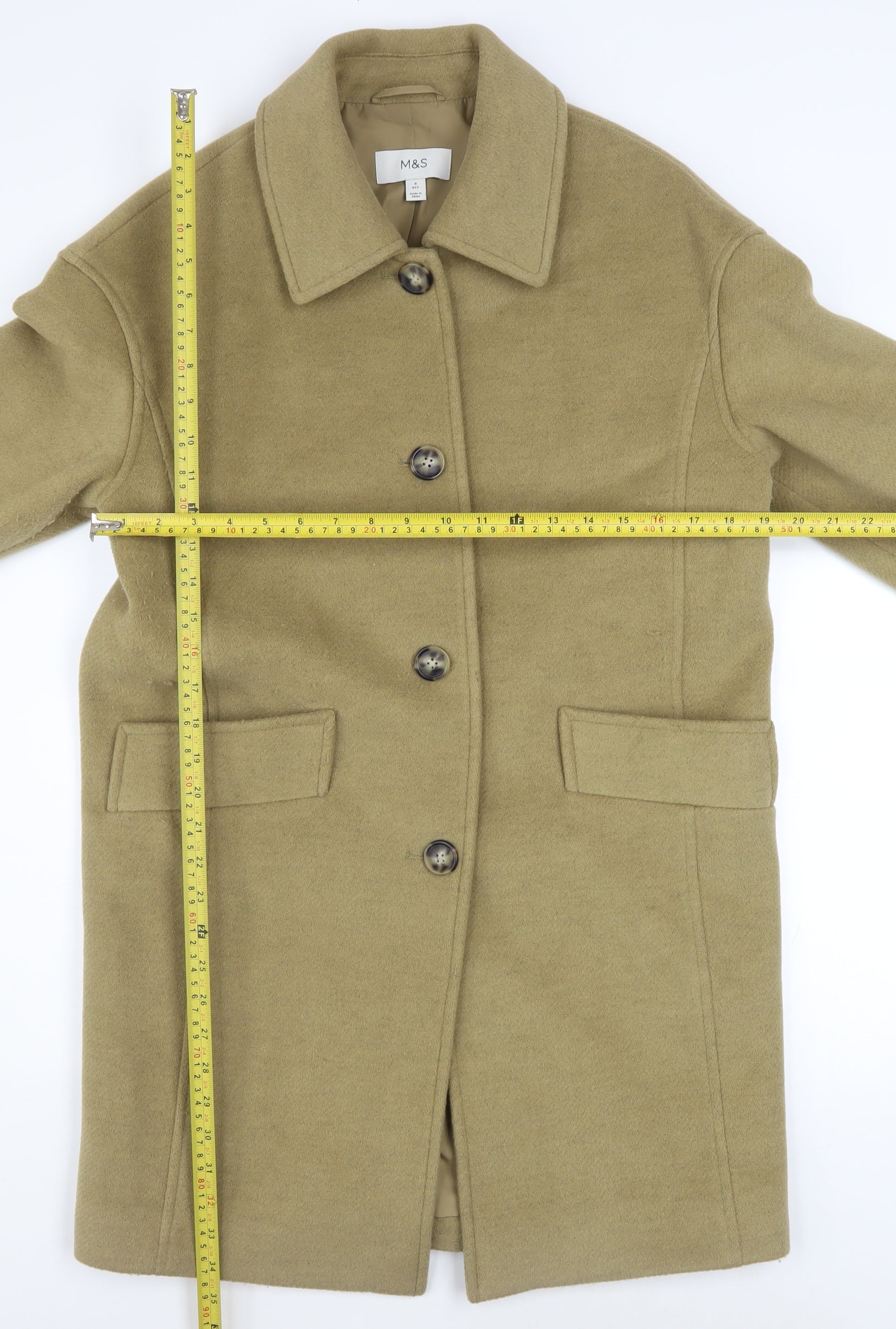 This elegant women’s mid-length coat from Marks and Spencer offers a timeless classic look ideal for autumn and winter wear. Crafted from a luxurious wool blend, the coat provides warmth, structure, and comfort with its soft yet durable outer shell. The neutral beige tone is versatile, pairing beautifully with both casual and smart outfits. Featuring a collared neckline, long sleeves, and a straight silhouette, it’s a refined choice for business attire or everyday layering. The button front closure is accented with large tonal buttons, bringing an understated yet sophisticated finish to the design. Two front flap pockets add practicality as well as style, perfect for keeping hands warm or holding small essentials. The interior is fully lined in smooth polyester, offering additional comfort and helping the coat drape gracefully over any outfit. The fabric composition includes 80% wool and 20% polyester, ensuring both insulation and durability without extra bulk. This regular-fit coat in UK size 8 offers a flattering, tailored appearance while allowing enough space for lightweight layers beneath. Ideal for cool weather, it’s designed to transition seamlessly from day to evening wear, making it a staple in any wardrobe. The overall condition is very good, with minor signs of gentle use seen at the cuff edge, yet it retains excellent shape and quality. Best cared for by dry cleaning, this coat promises long-lasting sophistication and reliable wear through multiple seasons. Whether worn with jeans and boots for a chic everyday look or styled over workwear for polish and warmth, this mid-length Marks and Spencer coat makes a stylish, practical addition to your outerwear collection. A beautiful and timeless piece at a great price point that embodies comfort, elegance, and versatility in one essential garment.