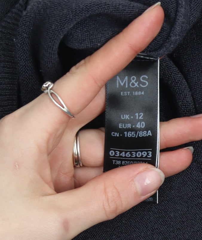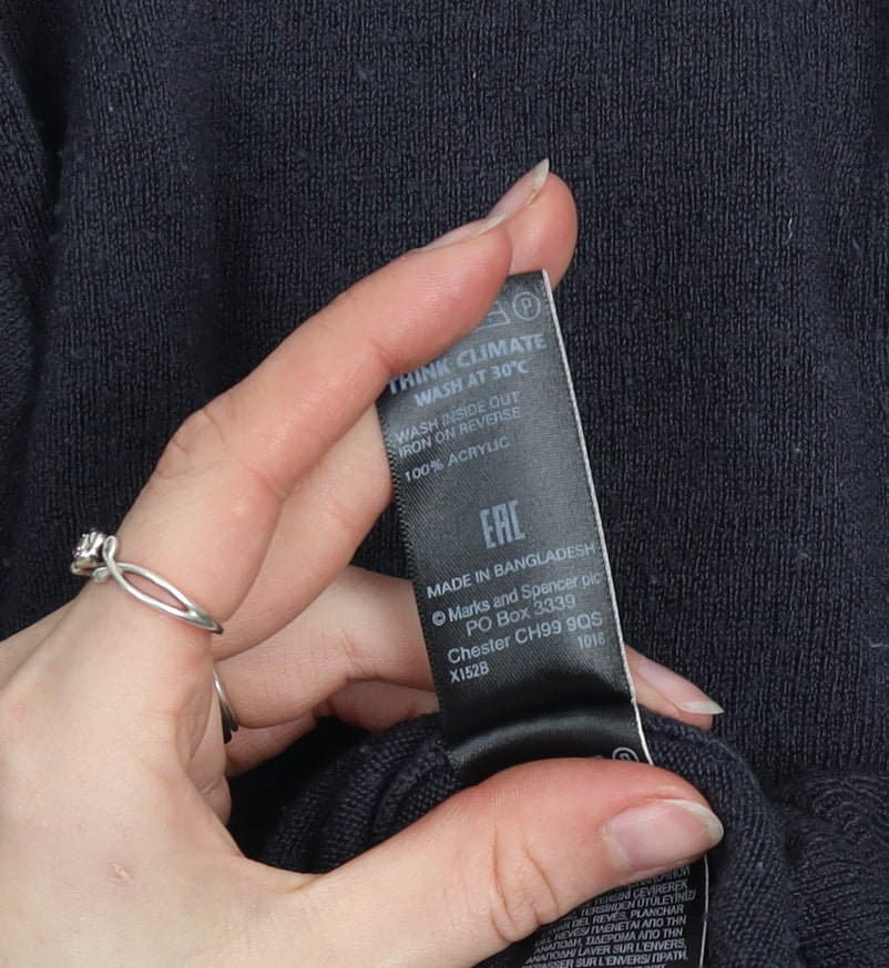 Refresh your knitwear collection with this timeless women’s black cardigan from Marks and Spencer. Crafted from soft, breathable acrylic in a lightweight knit, this versatile piece offers easy comfort and lasting wear. Featuring a classic crew neckline, full button front closure, and long sleeves, it’s ideal for layering during cooler months or adding polish to casual outfits. The fine tight-knit construction provides a smooth finish, while the ribbed trims at the cuffs and hem maintain shape and structure. Designed in a flattering regular fit, this cardigan works perfectly over blouses, dresses, or T-shirts for both workwear and weekend styling. The simple no-pattern design and elegant black colour make it a wardrobe staple that complements a wide range of looks – from smart office wear to relaxed casual ensembles. Suitable for autumn, winter, and spring, it offers the perfect balance of warmth and breathability. This piece remains in very good pre-loved condition, with only light wear noted on close inspection, enhancing its appeal as a quality knit at a reduced price. Machine washable for easy care, this Marks and Spencer cardigan represents both style and practicality. Whether you’re updating your everyday essentials or seeking a layering piece for transitional weather, this classic cardigan adds an understated touch of comfort and sophistication to your collection. Pair it with tailored trousers for a polished office outfit or jeans for effortless weekend elegance. A dependable, stylish addition to any contemporary wardrobe.
