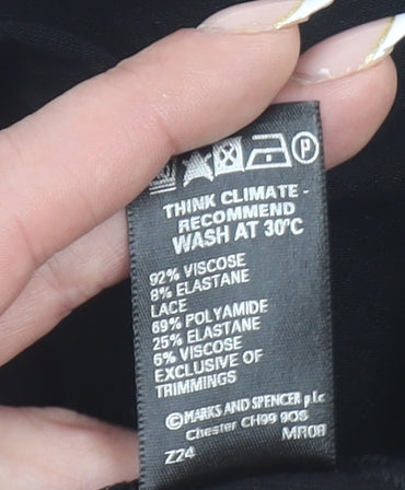This elegant Marks and Spencer women’s black camisole top in size 20 combines style and comfort for versatile everyday wear. Crafted from a soft blend of viscose and elastane, it offers a comfortable stretch fit that flatters the figure, creating a smooth silhouette. The lightweight jersey fabric feels breathable and gentle on the skin, ideal for layering or wearing on its own during warmer months. The sleeveless design with wide straps provides a classic and comfortable shape, while the scoop neckline is beautifully detailed with delicate lace trim, adding a touch of feminine charm and sophistication. The solid black tone makes this top effortlessly versatile — perfect for pairing with jeans and sandals for daytime casual wear or dressing up with tailored trousers and a blazer for an evening occasion. Designed with Marks and Spencer’s attention to quality and fit, this top is easy to care for with simple machine washing, maintaining both softness and durability over time. The stretch fabric allows ease of movement without compromising style, ensuring confidence and comfort in any setting. The tank-style cut makes it suitable for spring and summer seasons, though it can also transition into cooler months when layered under cardigans or jackets. Its timeless design and understated detailing offer a chic foundation piece for any wardrobe. In excellent pre-owned condition with no visible flaws or damage, this camisole is both practical and stylish, embodying the refined simplicity Marks and Spencer is known for. Whether for casual days or evenings out, this piece makes a dependable and flattering wardrobe essential that balances comfort, elegance, and versatility effortlessly.