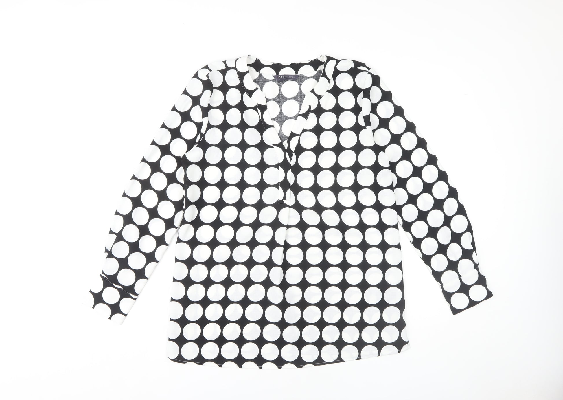 Elevate your wardrobe with this elegant Marks and Spencer women's blouse, perfect for adding a touch of sophistication to any outfit. Crafted from 100% polyester, this black polka dot blouse offers both comfort and style. Its V-neck design and long sleeves make it a versatile addition to your collection, suitable for workwear or casual occasions. The blouse is machine washable, ensuring easy upkeep, and its classic black and white pattern adds a chic look that never goes out of style. Ideal for women looking for a regular fit, this blouse in size 10 embodies a timeless appeal that will complement any wardrobe. Whether paired with trousers for the office or jeans for a relaxed day out, this piece will be a go-to favourite.