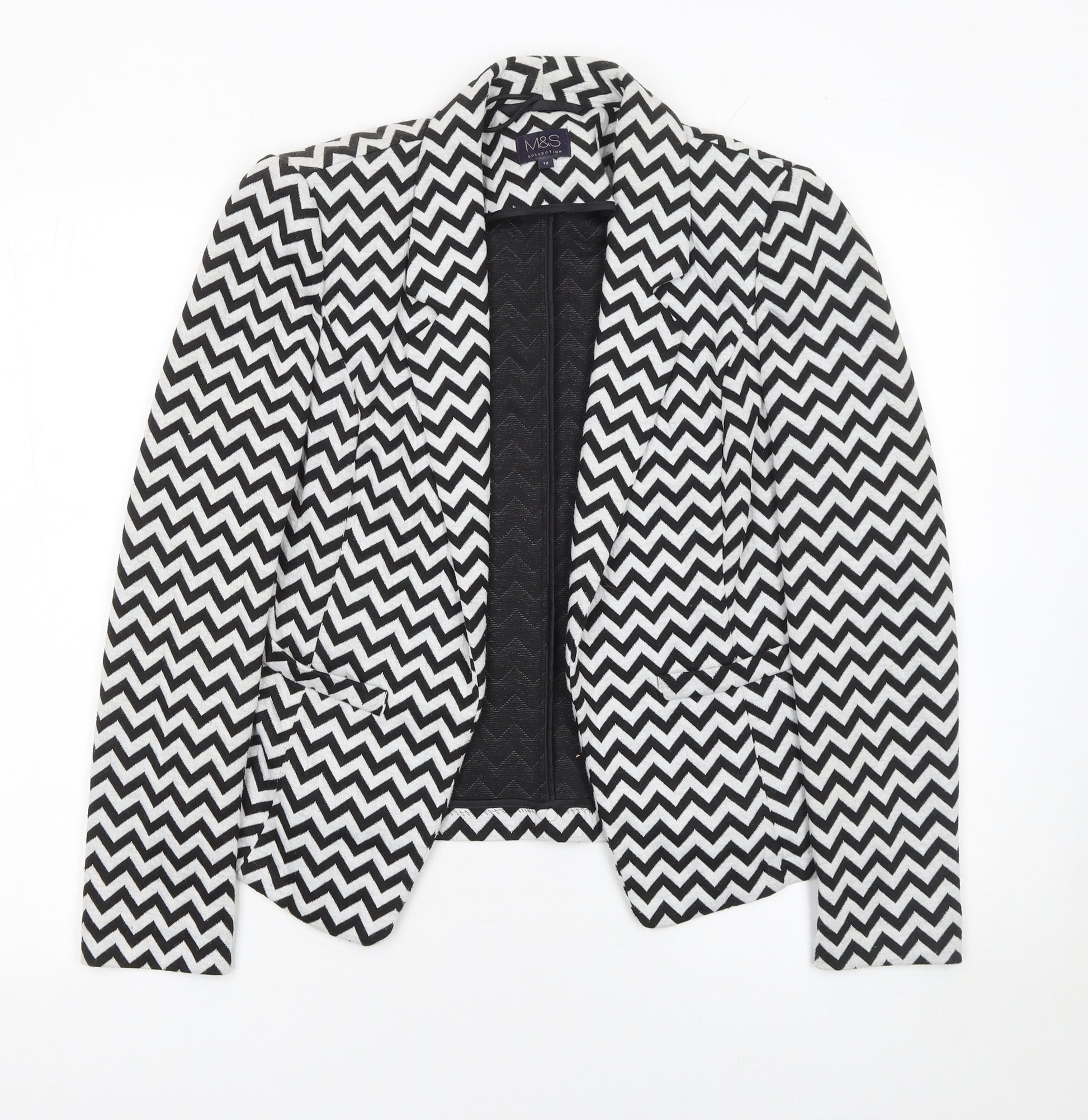 This smart and stylish Marks and Spencer women’s blazer in size 12 is the perfect addition to your wardrobe for both professional and casual wear. Crafted from a soft woven blend of 98% polyester and 2% elastane, it offers a comfortable touch with a subtle stretch, ensuring ease of movement while maintaining a flattering tailored silhouette. The eye-catching black and white chevron pattern adds a modern twist to a classic design, creating a standout look that transitions seamlessly from office to evening. Designed with a regular fit and a traditional notch lapel, this single-breasted blazer features a chic open front for a contemporary edge. It is fully lined for structure and comfort, making it ideal for layering over tops or dresses in cooler seasons. Perfectly suited for business, workwear, or smart casual occasions, this versatile piece pairs beautifully with black trousers, jeans, or skirts. The long sleeves and neat shaping through the body ensure a polished appearance every time you wear it. The blazer’s monochrome colour scheme allows for easy coordination with various outfits, while the bold zigzag print brings character and confidence to your style. Practical yet fashionable, it’s ideal for creating a strong, professional impression or for elevating a casual look. In very good condition with only a slight mark on the lapel, this quality garment has been well cared for and retains its original shape and detailing. Offering exceptional versatility, timeless appeal, and the reliable quality of Marks and Spencer, it’s an excellent choice for the modern woman seeking both comfort and sophistication.