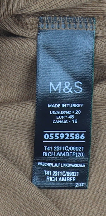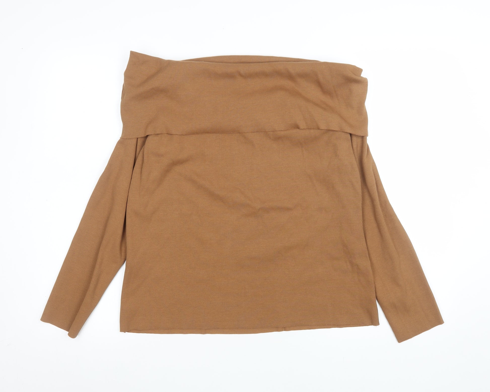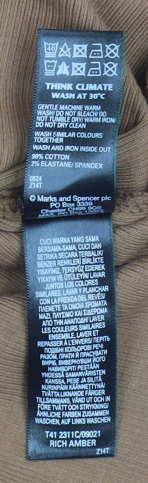 Elevate your everyday wardrobe with this stunning Marks and Spencer women’s off-shoulder top in a warm 'Rich Amber' brown shade. Designed to combine both comfort and effortless style, this long sleeve top is perfect for layering or wearing alone across multiple seasons. Crafted from a soft jersey blend of 98% cotton and 2% elastane, it offers gentle stretch for a flattering, easy-to-wear fit that moves with you while maintaining its shape throughout the day.The off-the-shoulder neckline brings a modern and chic twist to a classic silhouette, making it suitable for both casual days out and more dressed-up occasions. The smooth rib-knit texture adds subtle dimension, enhancing its feminine appeal while keeping it comfortable against the skin. Its lightweight yet durable fabric ensures breathability, ideal for autumn, spring, and cooler summer evenings.This top effortlessly complements jeans, tailored trousers, or skirts, allowing for versatile outfit styling from relaxed weekend looks to refined everyday ensembles. The rich brown tone pairs beautifully with neutral tones or can serve as a grounding hue for bolder accessories. A pullover style means it's easy to slip on and off, ensuring convenience while maintaining a polished appearance.Marks and Spencer's reputation for quality craftsmanship is evident here, offering a top that balances sophistication with practicality. Its regular fit provides a flattering drape while the stretch fabric enhances comfort. Perfect for women who appreciate timeless design with a touch of contemporary flair, this piece is a wardrobe staple ideal for seasonal transitions.Conditioned in excellent pre-loved state, this top shows minimal wear with no visible flaws. Priced competitively, it presents a fantastic value for anyone seeking a comfortable yet elegant piece to enhance their collection. Don’t miss the chance to add this versatile Marks and Spencer off-shoulder long sleeve top to your wardrobe – a perfect blend of chic styling, premium fabric, and everyday comfort.