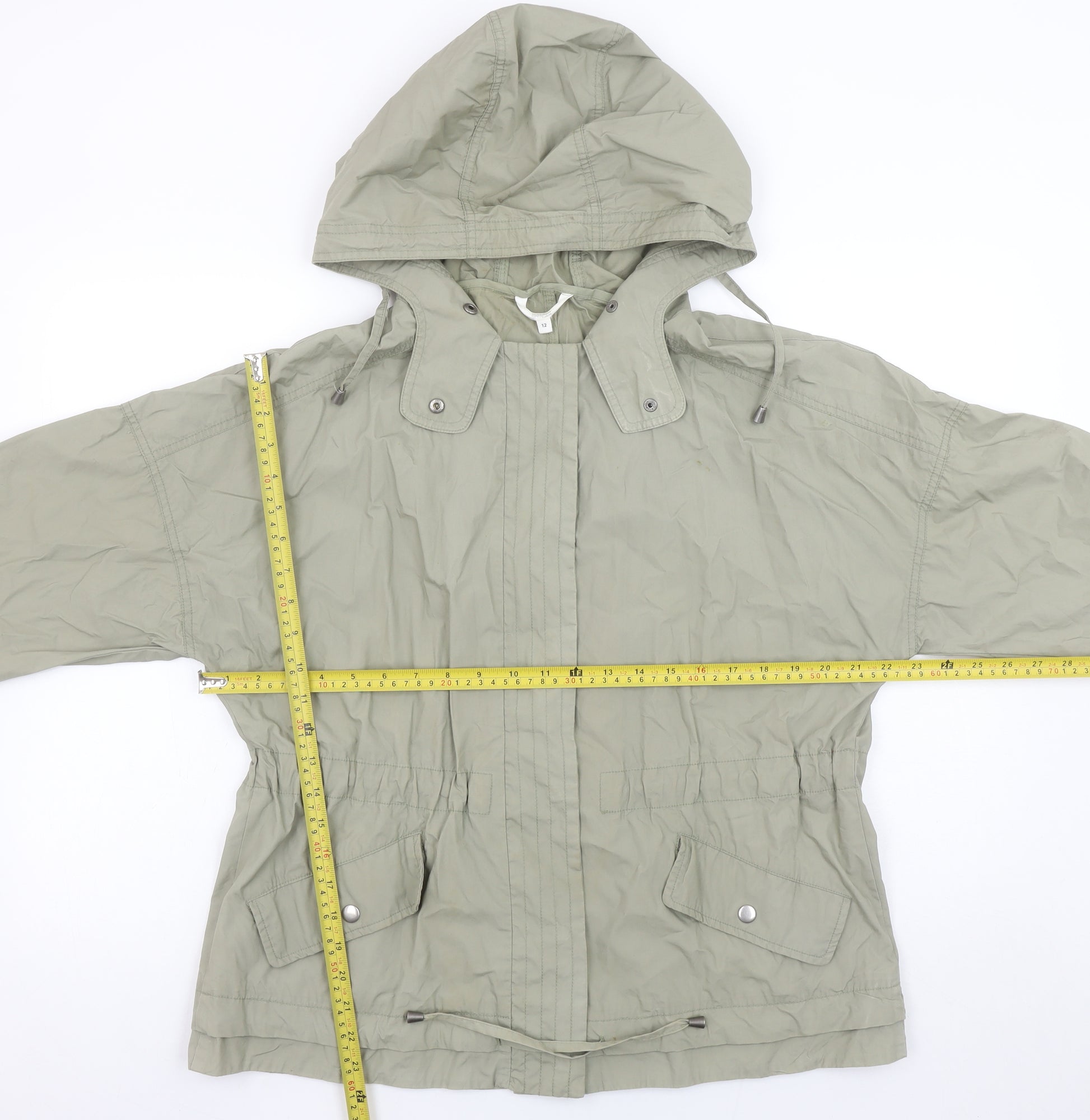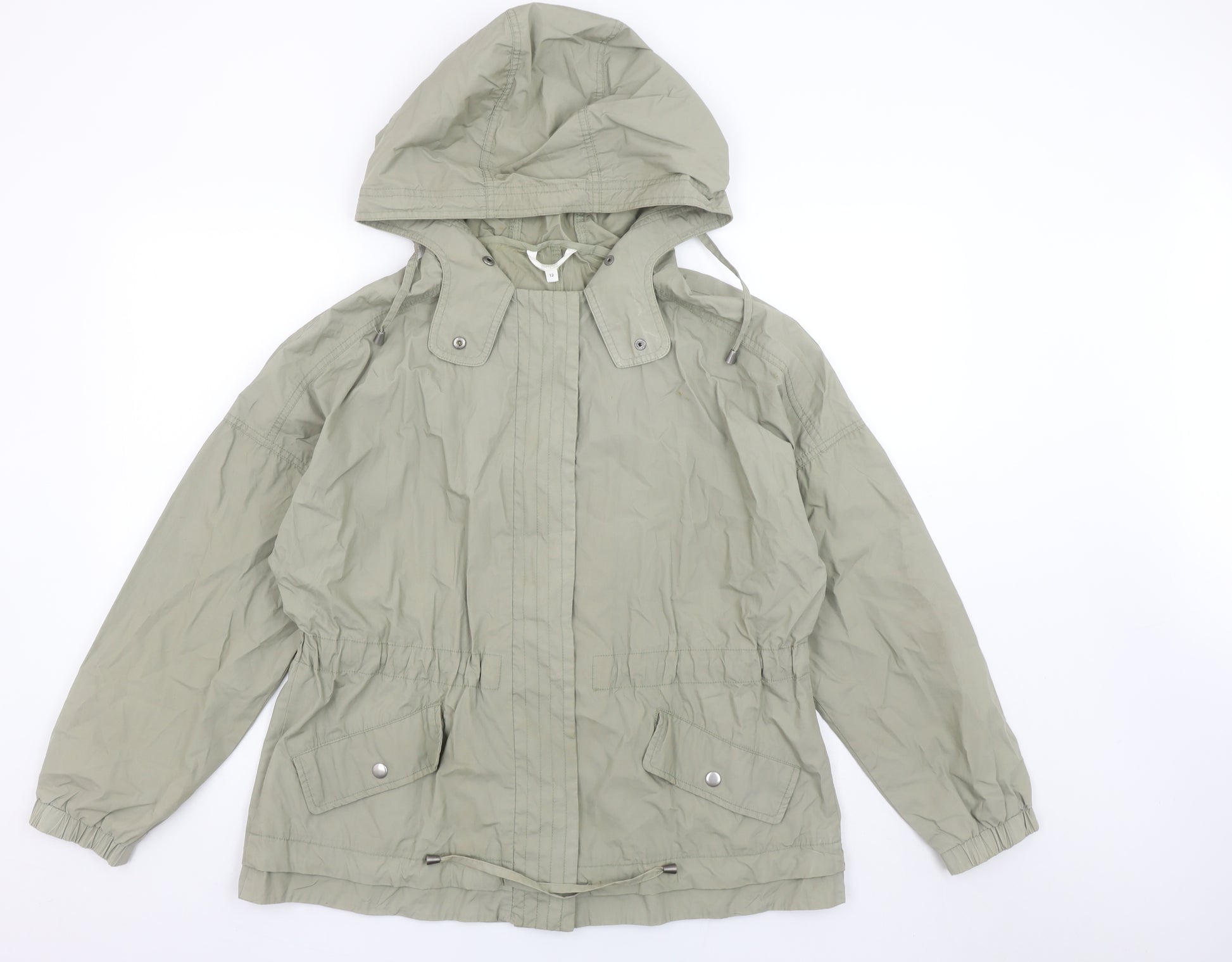 Stay stylish and practical in this Marks and Spencer women’s hooded anorak jacket in a subtle khaki green tone, perfect for versatile, year-round wear. Crafted from 100% cotton, this mid-length jacket provides a lightweight yet reliable layer for breezy autumn days and cool spring outings. The breathable cotton construction ensures comfort without compromising on durability, making it an easy everyday essential. With a relaxed yet flattering regular fit, it features a full front zip closure concealed by a snap-button placket, a functional drawstring waist to tailor your silhouette, and two spacious flap pockets with secure snap fastenings ideal for carrying small essentials. The adjustable hood adds extra protection against light showers, while the elasticated cuffs offer a snug finish that keeps out the chill. Designed with simplicity and utility in mind, this classic outdoor-inspired style works perfectly for casual wear and travel alike, offering a blend of practicality and understated elegance. Marks and Spencer’s dependable craftsmanship ensures quality construction and timeless appeal in every seam. Though previously loved, the jacket remains in very good overall condition, showing only minor marks on the back that do not detract from its charm or function. Machine washable for effortless care, this jacket is an easy grab-and-go piece when you need a stylish yet laid-back cover-up. Whether layered over jumpers for cool evenings or paired with jeans for weekend strolls, it’s the kind of versatile wardrobe staple you’ll reach for again and again. Effortlessly functional, fashionably simple, and responsibly crafted, this Marks and Spencer women’s hooded cotton jacket offers comfort and classic appeal in one. A practical and timeless outerwear piece for transitional seasons, ready to complement any casual outfit with ease.