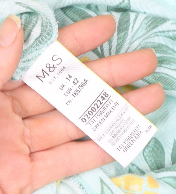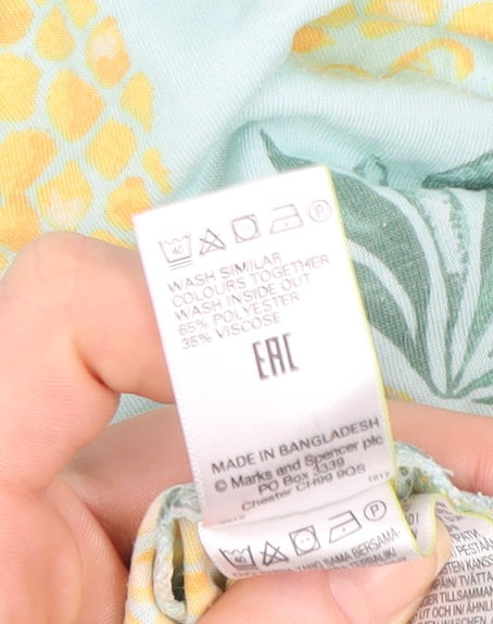 Add a vibrant tropical touch to your wardrobe with this Marks and Spencer women’s green pineapple print T-shirt, perfect for sunny days and relaxed casual outings. The fun and fresh design features cheerful yellow pineapples on a soft green background, creating an easygoing summer vibe that pairs beautifully with jeans, shorts, or a skirt. Crafted from a comfortable polyester and viscose blend, this lightweight jersey fabric offers a smooth finish that feels soft against the skin while allowing breathability for all-day wear. Designed by Marks and Spencer, a brand known for quality and effortless style, this women’s short sleeve T-shirt combines comfort with cheerful charm. The regular fit and crew neckline make it a flattering and easy-to-wear piece that complements a wide range of body types. The simple pullover style and easy-care fabric make it a practical choice for everyday wear, travel, and holidays. Whether you're heading out for a casual day with friends, enjoying a beachside stroll, or relaxing at home, this top adds a splash of tropical fun to any outfit. Ideal for spring and summer seasons, it keeps you cool while maintaining a stylish edge. Condition is excellent with no visible flaws or damage. This pre-loved top has been well cared for and retains its softness and bright colour. If you enjoy fresh, playful prints that express positivity and personality, this pineapple printed T-shirt from Marks and Spencer is a must-have addition to your casual collection. Refresh your everyday essentials with something lighthearted, colourful, and easy to wear – ideal for brightening up your day and wardrobe alike.