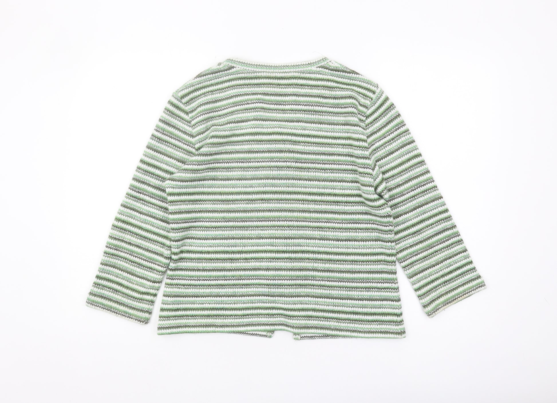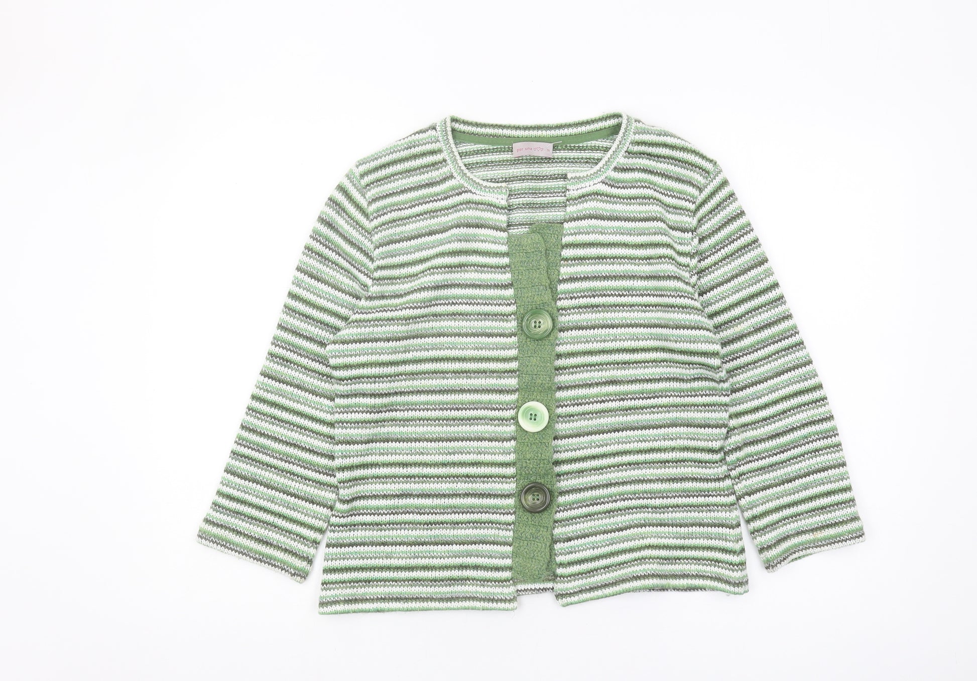 Discover comfort and style with this Marks and Spencer Women’s Cardigan, perfect for adding a touch of elegance to your casual wardrobe. Crafted for the modern woman, this cardigan reflects a classic yet trendy design, featuring a green striped pattern that echoes nature's tranquil hues.The cardigan is fashioned in a regular fit to provide ease of movement and flattering shape. Crafted from a blend of 87% Acrylic and 13% Polyester, it promises durability and comfort, maintaining its structure and vibrant color even after multiple washes. The lightweight, tight-knit fabric drapes smoothly, making it an ideal piece for layering during the Spring season.Designed with a crew neck and accented with stylish buttons along the front, it adds a hint of sophistication to any casual ensemble. Timeless in its appearance, it features 3/4 sleeves, balancing between coverage and style beautifully.Marks and Spencer has meticulously crafted this piece for women who appreciate practical elegance in their daily wear. Machine washable for easy care, this cardigan ensures you remain effortlessly stylish without the hassle of complicated maintenance.Whether you're heading to a brunch with friends or a relaxed day at home, this cardigan is ready to complement your style. Slip it over your favorite t-shirt or blouse for that added layer of snug comfort and chic design.Embrace the opportunity to elevate your casual look with this versatile and stylish cardigan. Its classic design combined with sturdy, long-lasting material ensures that this investment piece will remain a staple in your wardrobe for seasons to come.