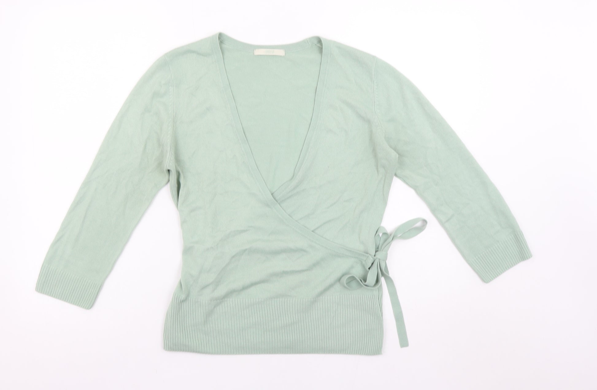 Add effortless elegance to your wardrobe with this stylish Marks and Spencer women’s wrap jumper in a soft dusted mint green shade. Crafted entirely from lightweight, comfortable acrylic knit, this piece provides a wonderful balance of everyday versatility and refined casual charm. The V-neckline and self-tie wrap design create a beautifully flattering silhouette, while the ribbed hem and cuffs bring gentle structure and texture. Designed with 3/4 length sleeves, this jumper is ideal for layering through transitional seasons such as spring and autumn. The wrap style allows for an adjustable, body-hugging fit that suits a variety of shapes, making it a great go-to option for both day and evening looks. Pair it with jeans or tailored trousers for workwear chic or dress it up with accessories for an evening gathering. The breathable and easy-care acrylic fabric ensures comfort and longevity while maintaining a clean, sleek appearance. Its simple, no-pattern design in muted green tones makes it a timeless piece that complements wardrobes with understated sophistication. Conditioned in excellent, gently used state with no visible flaws or damage, this jumper remains a high-quality fashion staple. It’s ideal for casual or semi-smart occasions where comfort meets elegance. Suitable for layering under coats or over camisoles, this regular-fit jumper offers both style and practicality. A perfect addition for those who appreciate Marks and Spencer’s trusted quality and classic British design aesthetic. Priced affordably for great value, this wrap jumper offers both comfort and polish in one effortlessly wearable piece.