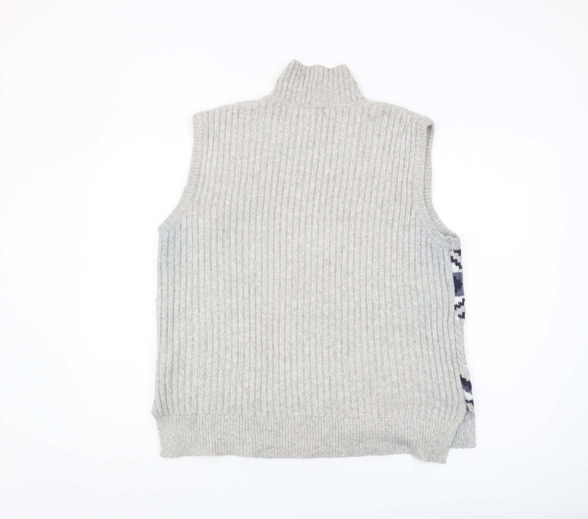 Elevate your wardrobe with this stylish Marks and Spencer women's vest in a sophisticated combination of grey and blue. Ideal for casual wear, this sleeveless vest features a classic roll neck design and comes in a regular size L. The geometric pattern adds a modern touch, while the cable-knit style offers texture and warmth. Made from a blend of polyester, acrylic, and polyamide, this piece ensures both comfort and durability. Perfect for autumn and winter seasons, this vest is machine washable for easy care. Pair it with jeans or layer over a long-sleeve top for a chic look.