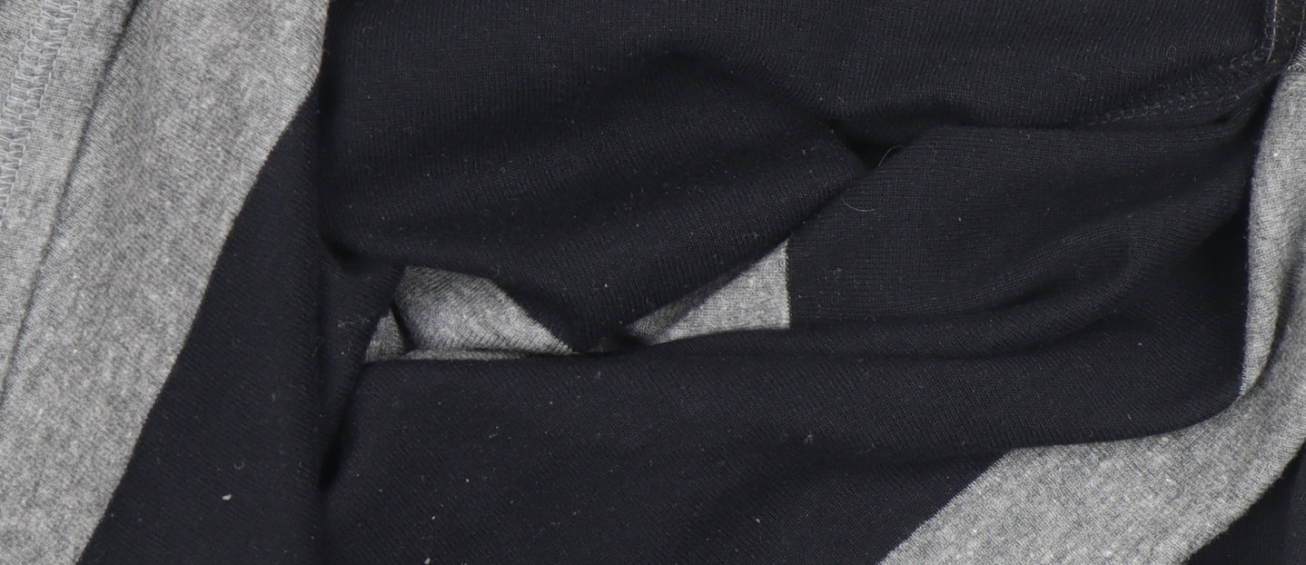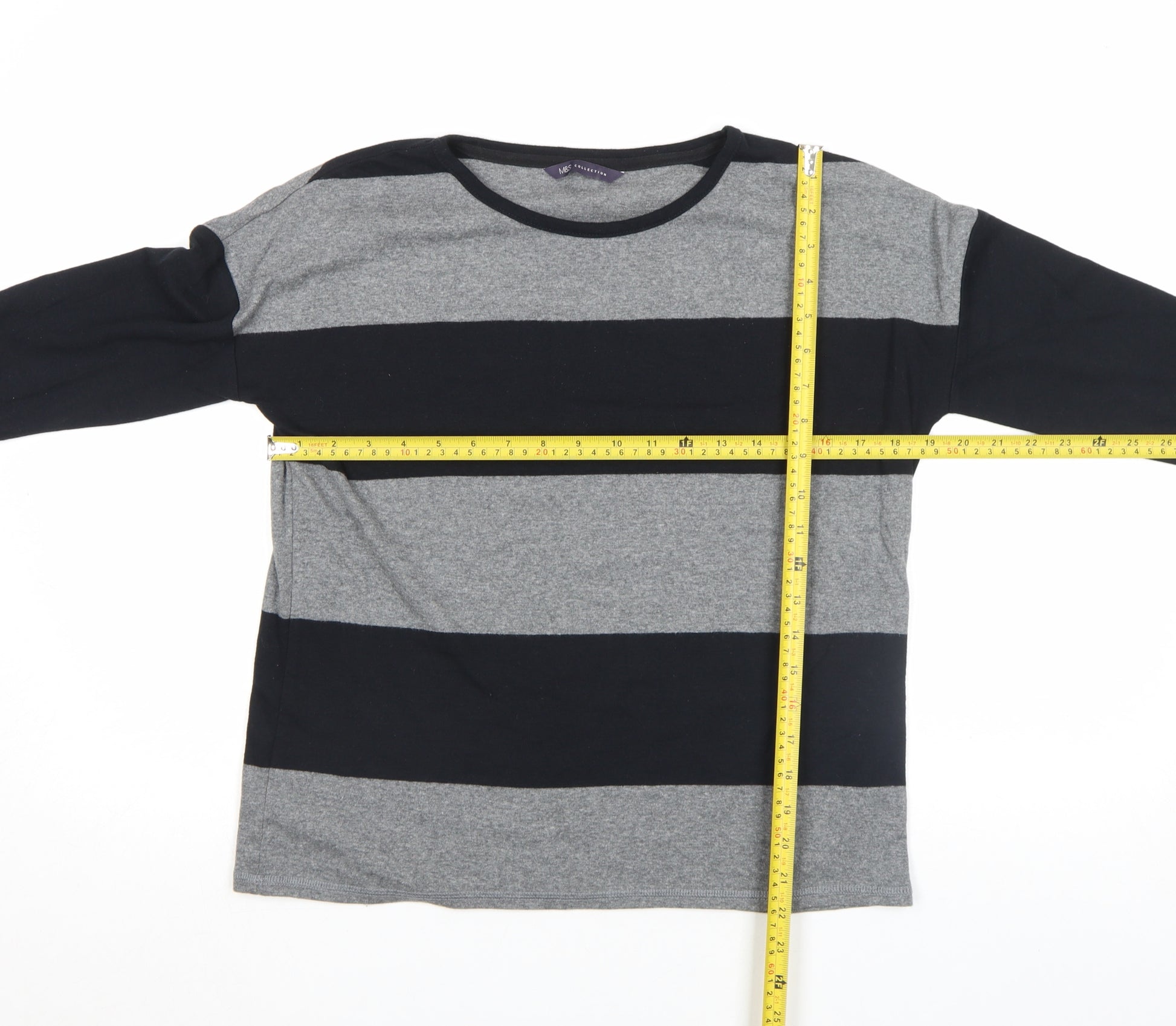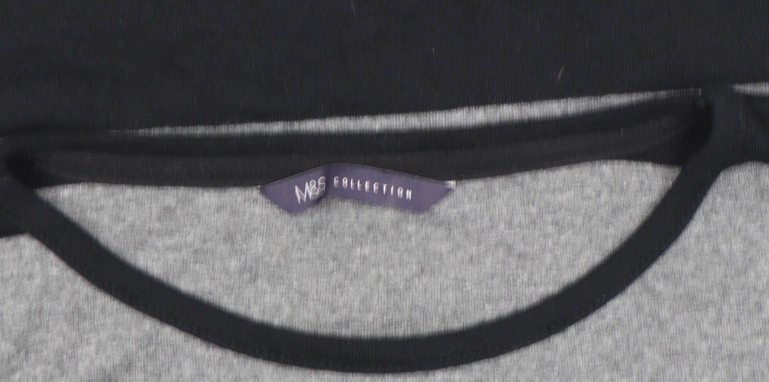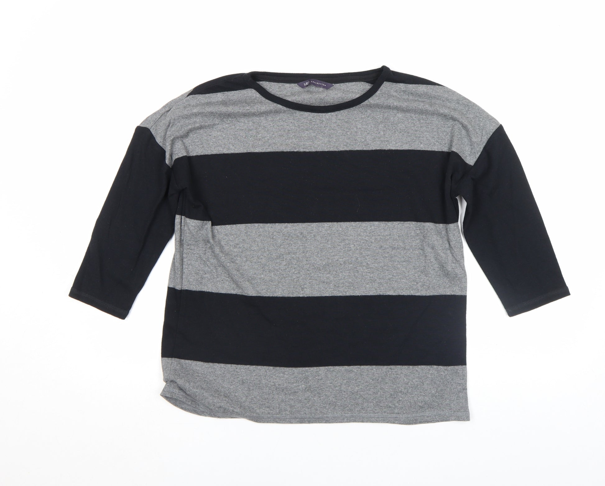 Add a touch of effortless style to your everyday wardrobe with this Marks and Spencer Women’s grey and black striped T-shirt. Crafted from a soft jersey fabric, this top perfectly balances comfort and durability thanks to its blend of cotton, polyester, and elastane — providing a lightweight, breathable feel with just the right amount of stretch for easy movement. The timeless horizontal stripe design adds a classic yet contemporary charm, making it an easy piece to pair with jeans, skirts, or casual trousers. Designed in a flattering regular fit, the T-shirt features comfortable 3/4 length sleeves and a subtle boat neckline, offering an elegant yet relaxed silhouette suitable for all-day wear. Ideal for transitional seasons like spring and autumn, this versatile top can be layered under a jacket for cooler days or worn on its own for a more laid-back look. The breathable jersey knit ensures a smooth, soft texture against the skin, while its easy-care machine-washable fabric makes it as practical as it is stylish.Perfect for casual occasions, weekend outings, or even relaxed office days, this Marks and Spencer striped top is a go-to essential that blends quality craftsmanship with timeless British design. The monochrome palette lends itself beautifully to wardrobe versatility, pairing seamlessly with neutrals or adding contrast to bolder colours. Lightly worn yet in excellent overall condition, this piece retains its shape, colour, and softness without signs of significant wear. Whether you’re refreshing your existing collection or looking for an easy everyday essential that doesn’t compromise on comfort or style, this top embodies Marks and Spencer’s heritage of everyday luxury and reliable quality. Bring home a wardrobe staple that’s effortlessly flattering, simple to style, and built to last — the perfect combination for any modern woman’s collection.