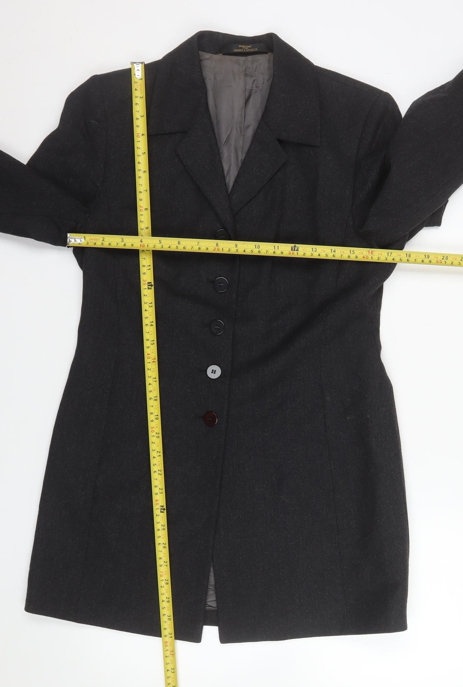 Elevate your wardrobe with this beautifully tailored Marks and Spencer women's grey wool blend overcoat. A classic piece from the iconic St Michael collection, it combines timeless sophistication with a flattering fit designed especially for petites. Crafted in the U.K. from a premium mix of 97% wool and 3% elastane, the fabric offers both warmth and subtle stretch for comfort and ease of movement. The coat features a sleek single-breasted design with four coordinating buttons, a structured collar, and long sleeves finished with button details at each cuff. Blending quality craftsmanship and enduring style, the coat is lined with smooth viscose to ensure a comfortable wear and elegant drape. The rich grey hue makes it versatile for a variety of occasions, easily pairing with both business and evening ensembles. Perfect for autumn and winter, this mid-length overcoat complements tailored trousers, dresses, or chic skirts, creating a refined, polished silhouette. The wool-rich outer shell provides insulation while maintaining breathability, making it a practical choice for cooler weather. Marks and Spencer’s St Michael range is renowned for its durability and classic appeal — this coat embodies both, with subtle detailing that reflects exceptional attention to design. Although gently pre-loved, it remains in excellent condition with only slight wear visible around the collar, ensuring it retains its elegant look. Ideal for business meetings, formal occasions or everyday sophistication, this versatile grey overcoat is a must-have investment piece that will never go out of style. Combining classic tailoring with modern comfort, it’s a timeless essential for any wardrobe that favours quality and grace.
