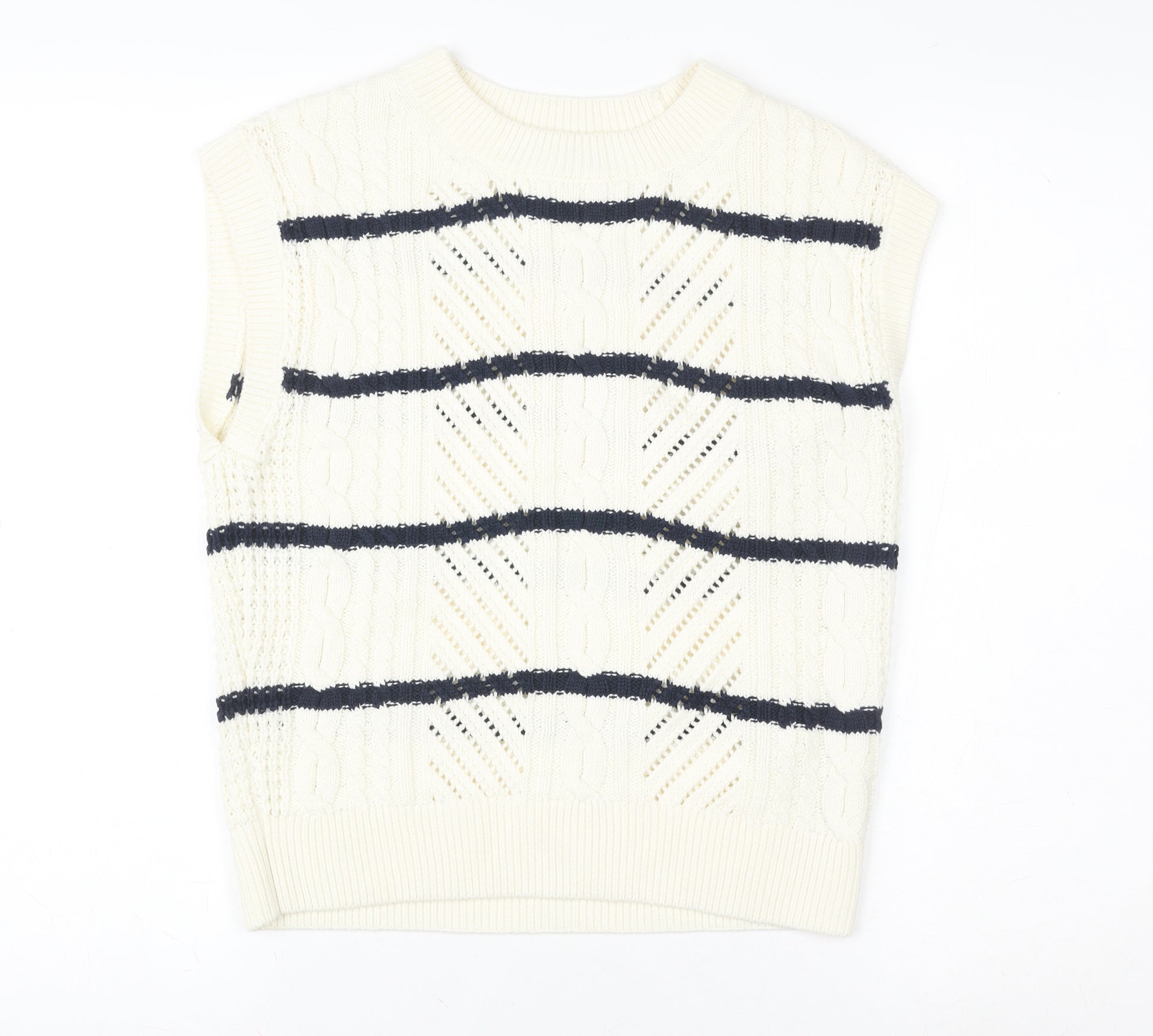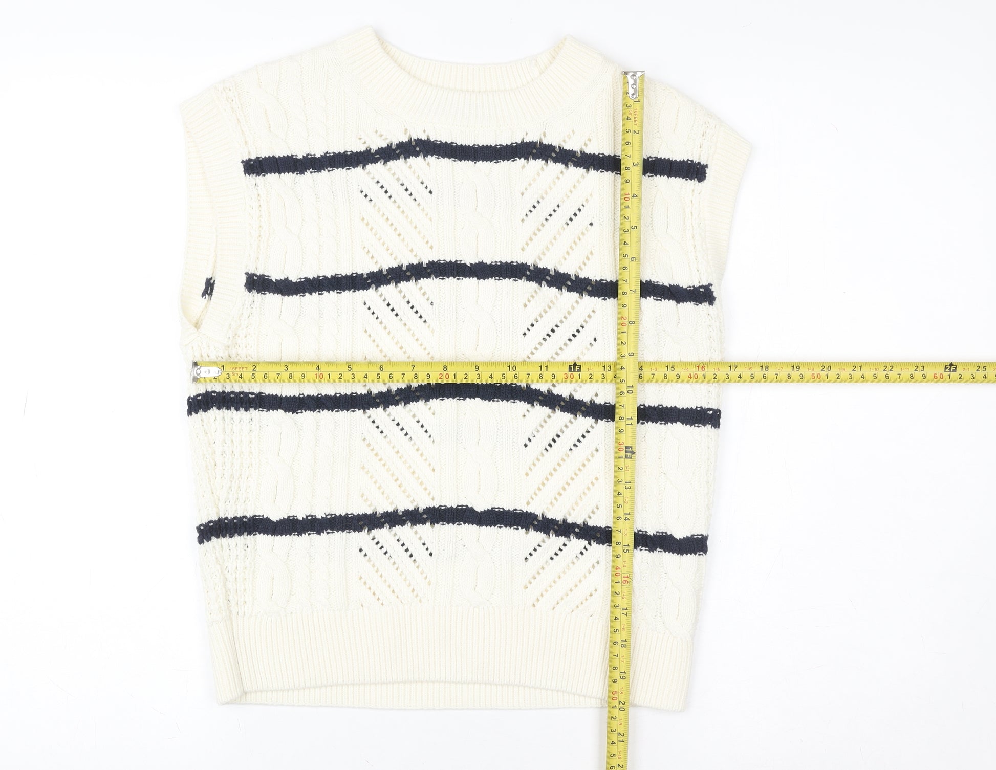 Step into timeless style with this Marks and Spencer Women’s Ivory Striped Knit Sleeveless Vest, a versatile layering piece perfect for adding texture and warmth to your wardrobe. Crafted from a soft cotton and acrylic blend, this breathable knit provides comfort while maintaining shape and durability wash after wash. The elegant ivory base is accented with horizontal navy stripes in a cable-knit pattern, giving a classic nautical-inspired look that transitions beautifully across seasons.Designed with a crew neckline and sleeveless cut, this vest is ideal for pairing over crisp shirts, blouses, or lightweight turtlenecks, allowing for versatile styling whether dressed up or down. The ribbed trims at the neck, armholes, and hem add a refined touch and ensure a snug, polished fit. Lightweight yet cosy, it works perfectly for layering during spring mornings, autumn afternoons, or mild winter days.The regular fit flatters most body shapes without feeling restrictive, offering a relaxed but neat silhouette. Its machine washable construction makes it easy to care for and maintain. Marks and Spencer’s superior craftsmanship ensures this piece stays soft and stylish, making it a durable staple in any wardrobe.This ivory striped sleeveless jumper vest is suited for casual weekends, stylish workwear layering, or smart-casual occasions where comfort meets classic design. Combine it with tailored trousers or jeans for an effortlessly chic ensemble. A versatile, lightweight knit that embodies M&S quality and timeless appeal — perfect for elevating your everyday look while keeping you comfortably elegant throughout the seasons.
