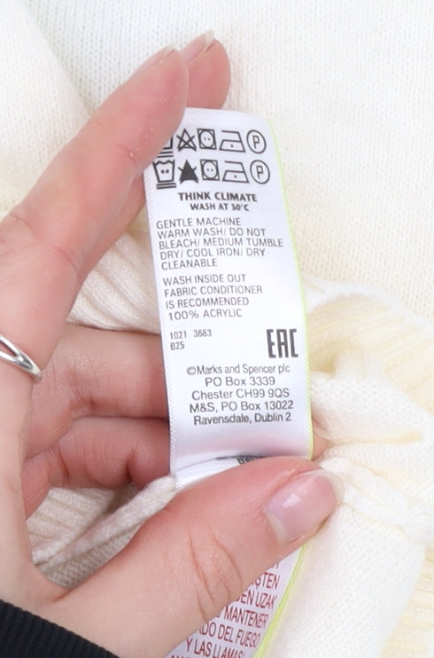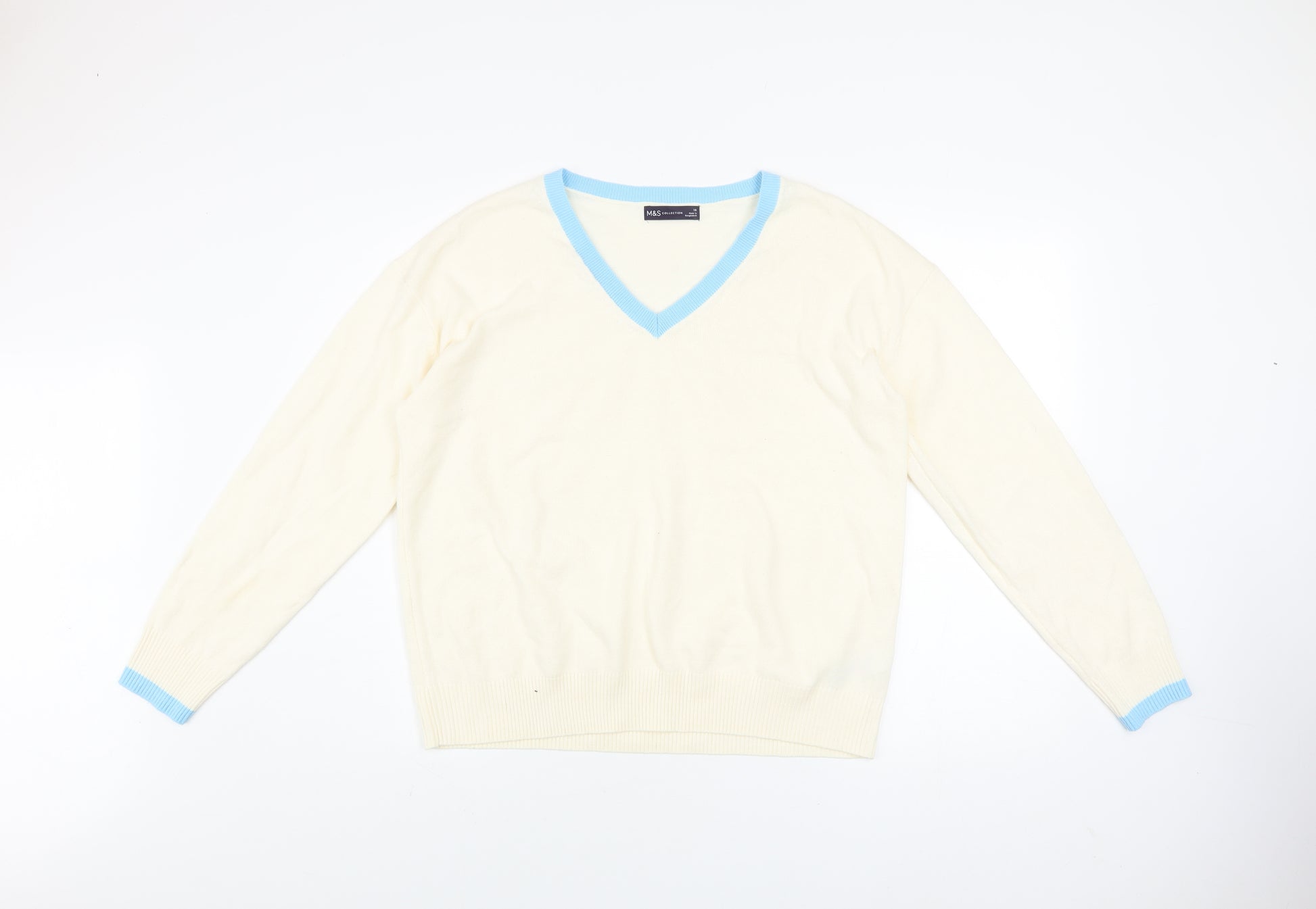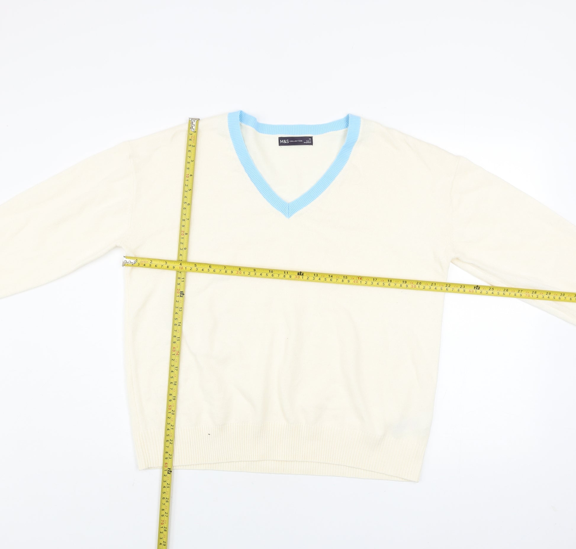 Stay effortlessly stylish and cosy with this Marks and Spencer Women’s Ivory V-Neck Knit Jumper in Size 16. Crafted entirely from soft acrylic, this lightweight pullover offers the perfect balance of comfort, warmth, and easy care. Its smooth, tight-knit design ensures a flattering fit that works perfectly for everyday wear, whether layered over a shirt or worn solo for a relaxed yet polished look. The crisp ivory base is beautifully complemented by delicate sky-blue trim along the neckline and cuffs, giving it a fresh and modern touch suitable for multiple seasons. The long sleeves and ribbed hem offer a classic shape that flatters most body types while keeping you comfortable through autumn, winter, and cool spring days. Designed for women who value both practicality and timeless style, this jumper from Marks and Spencer brings versatility to your wardrobe—ideal for casual outings, cosy weekends, or workplace layering. As an easy-care piece, it’s fully machine washable, making it a durable staple for everyday rotation. Though lightly worn with only faint marks visible near the hem, the garment remains in excellent condition, showing minimal signs of previous use. With its dependable M&S quality, classic V-neckline and softly textured knit, this jumper makes an elegant yet simple addition to any wardrobe. Pair it with jeans, tailored trousers, or even a midi skirt for an effortlessly chic ensemble suitable for all seasons and occasions where comfort meets understated sophistication.