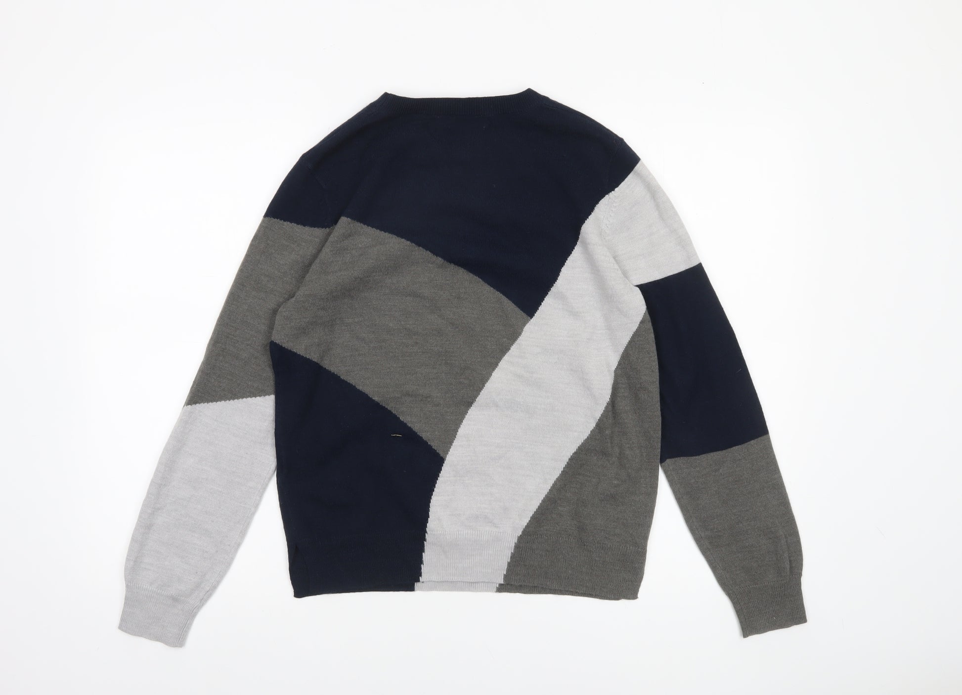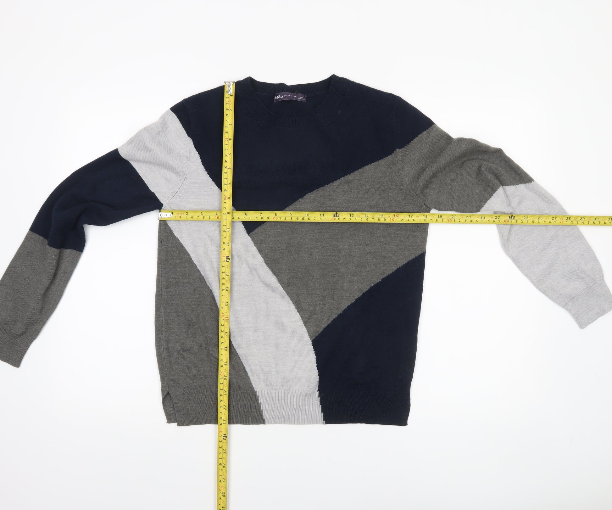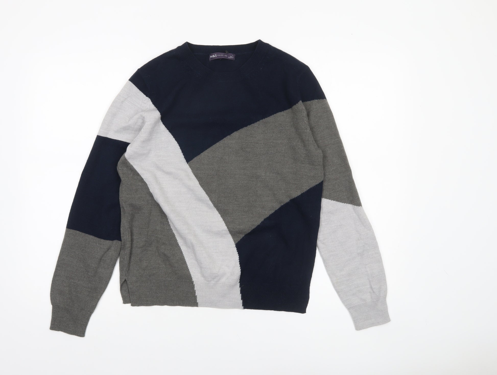 Add a touch of modern style to your everyday wardrobe with this beautifully crafted Marks and Spencer women’s jumper. Designed in a distinctive geometric pattern combining navy, grey, and light grey tones, this piece offers a contemporary take on classic knitwear. The pullover style in soft, breathable knit fabric ensures lasting comfort and easy wear, ideal for cooler days. Its crew neckline and long sleeves provide a refined yet cosy silhouette that complements both casual and smart-casual looks. Made from a high-quality blend of cotton, polyamide, and viscose, it offers the perfect balance of comfort, durability, and lightweight warmth. The knit fabric delivers a smooth, tight-knit finish that retains shape wash after wash. Perfect for autumn, winter, and the start of spring, this versatile jumper layers effortlessly over shirts or under coats. Whether heading to work, running errands, or meeting friends, it brings effortless polish to any outfit. Designed in a regular fit, it’s both flattering and easy to wear, offering a relaxed but structured finish. The Marks and Spencer Collection label guarantees trusted British quality and timeless design. In excellent pre-owned condition, with no visible flaws, this jumper is ready to become a go-to wardrobe essential for the modern woman who values comfort and sophistication. Pair it with tailored trousers for a polished office ensemble or denim jeans for a chic off-duty look. A reliable choice for all seasons, this stylish jumper promises to add a touch of understated elegance to your collection—sophisticated styling effortlessly combined with practicality and comfort for everyday wear.