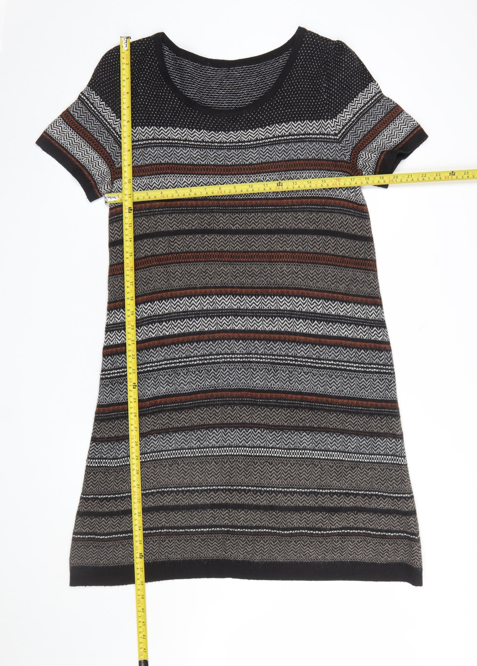 Step into effortless everyday style with this lovely Marks and Spencer women’s multicoloured shift dress in size 16. Made from a comfortable and soft knit blend, it’s crafted with 67% acrylic, 14% viscose, 10% polyamide, 7% cotton and 2% mohair for a cosy and flexible feel. The geometric pattern in tones of black, grey, brown and orange gives it a timeless yet modern look, perfect for layering during cooler days or wearing on its own in milder weather. With a round neckline and short sleeves, this dress offers a relaxed and flattering silhouette that makes it a go-to piece for a range of occasions. Whether paired with tights and boots for autumn walks or dressed up with a jacket for casual dinners, it’s a versatile wardrobe staple you’ll turn to time and again. The knee-length design ensures modest coverage while remaining easy to move in, and the lightweight knit fabric adds comfort without bulk. Its pullover style allows for effortless wear, while the soft texture and gentle stretch fabric enhance comfort and fit. Ideal for casual outings, everyday wear, or workwear in a relaxed setting, this Marks and Spencer dress ticks all the right boxes for style and practicality. In excellent pre-owned condition with no visible flaws, this piece delivers great quality and value. Refresh your wardrobe with a classic yet versatile staple that combines Marks and Spencer’s trusted craftsmanship with an attractive design you can wear all season long.