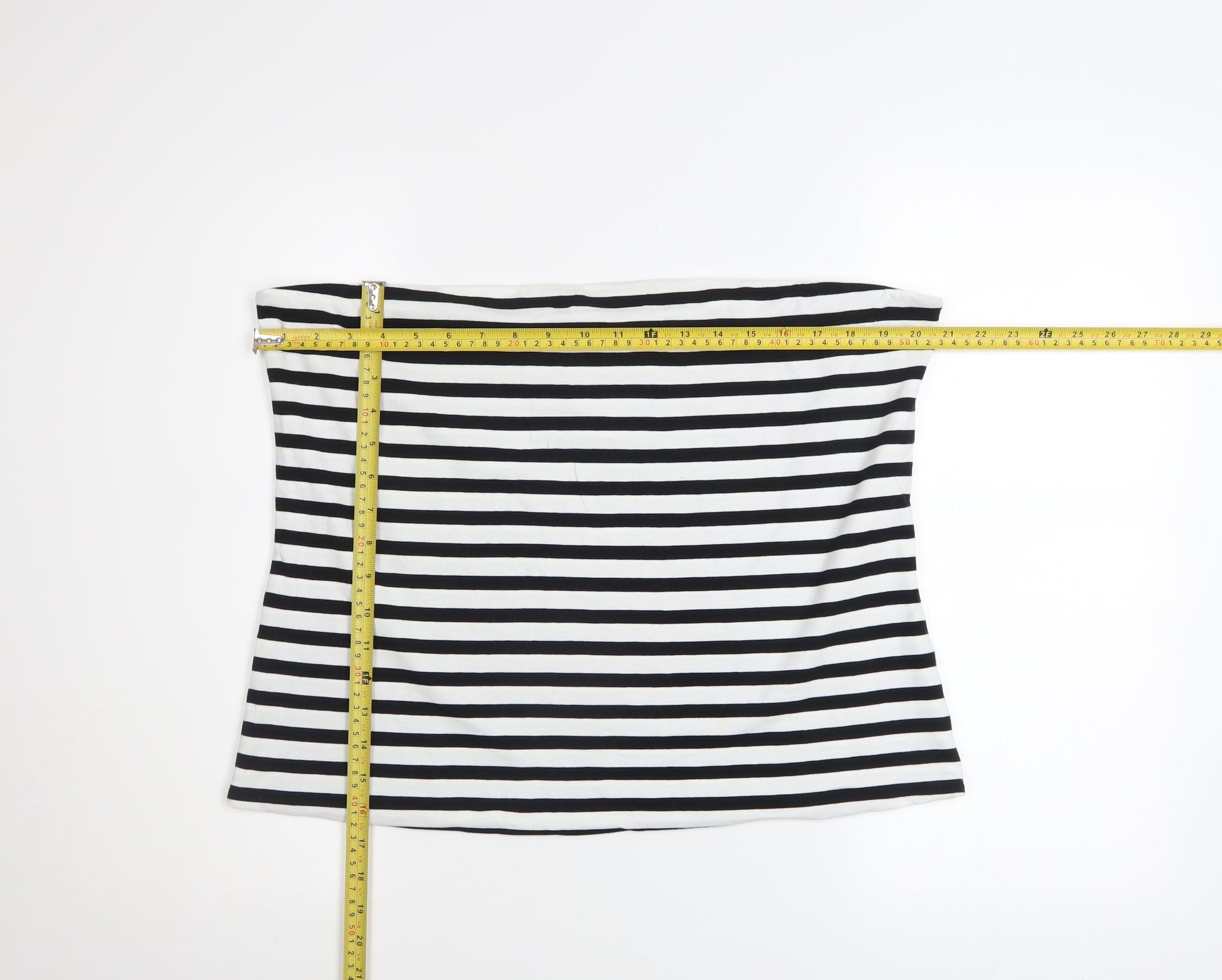 Add a touch of effortless summer chic to your wardrobe with this stunning Marks and Spencer women’s black and white striped strapless top in size XL. Crafted from a soft stretch jersey fabric, this versatile tube-style camisole top offers a snug yet comfortable fit thanks to its premium blend of cotton and elastane. The breathable material ensures optimum comfort during warmer weather while maintaining its shape wash after wash.Designed in a classic horizontal stripe pattern, this piece has a timeless nautical-inspired look that pairs beautifully with both casual and smart-casual outfits. Whether matched with denim shorts for a relaxed coastal vibe or worn under a tailored blazer for a chic urban edge, it’s the perfect go-to top for any summer occasion.The strapless neckline gives it a smooth, streamlined silhouette that flatters the shoulders and neckline, making it ideal for holidays, daytime strolls, or pairing with statement jewellery for evening outings. Easy to care for, this top is fully machine washable and quick drying, providing practicality as well as effortless style.Made by Marks and Spencer, a brand well-known for its reliable quality and comfort, this piece embodies everyday elegance and versatility. With its classic look, soft feel, and regular fit design, this striped tube top is a wardrobe staple that combines flexibility, ease of movement, and an effortlessly feminine touch. Perfect for casual, travel or everyday wear, this piece will quickly become one of your favourite essentials for the Spring and Summer seasons.
