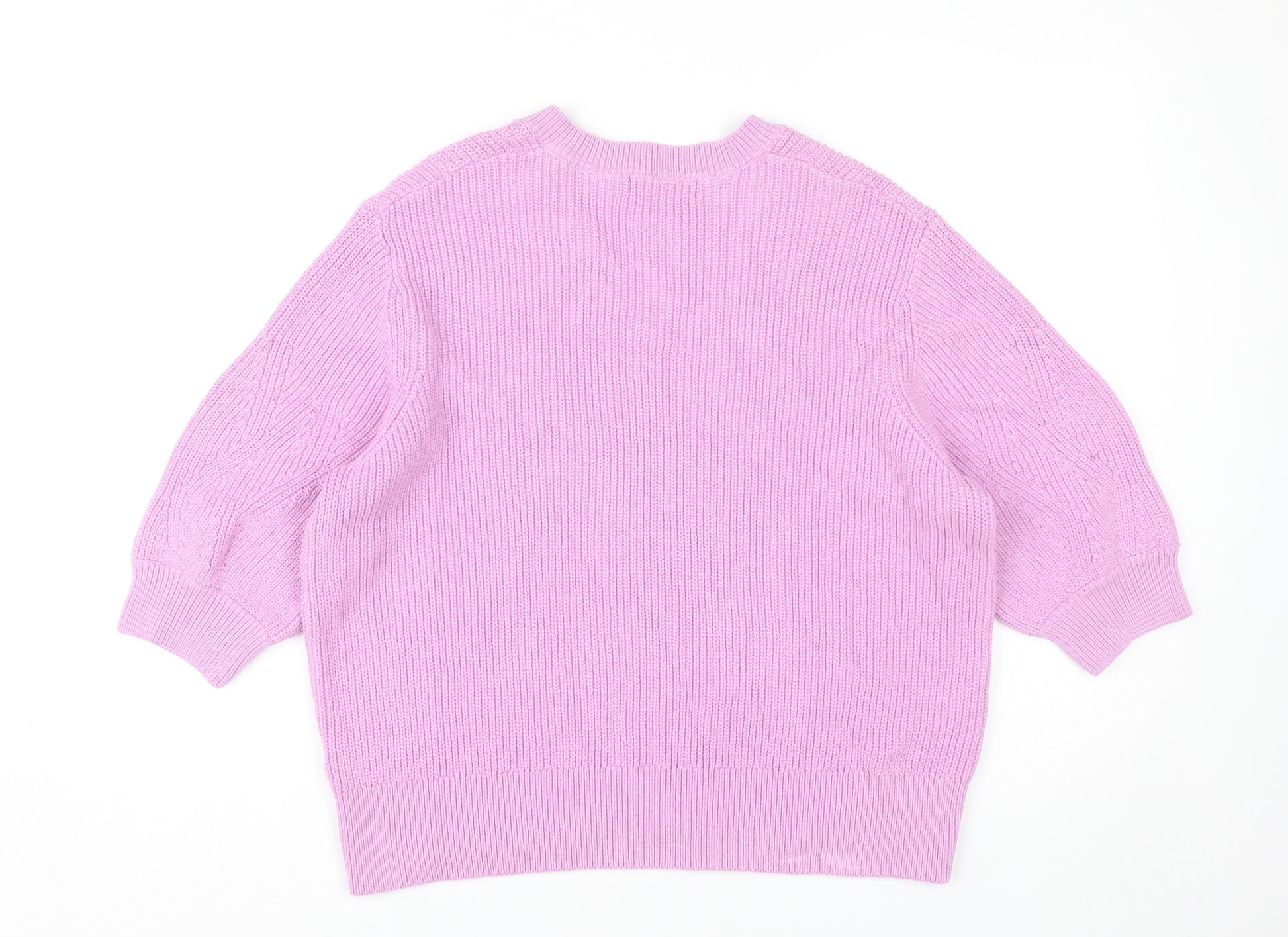 Elevate your knitwear collection with this beautifully crafted Marks and Spencer women's jumper, designed to bring both comfort and style to your layering wardrobe. Presented in a soft and versatile shade of pink, this pullover jumper is ideal for adding a touch of femininity to your casual looks. The elegant V-neckline creates a flattering silhouette, while the eye-catching cable-knit pattern on the front offers a classic textured detail that never goes out of style. With its cosy yet breathable construction, this jumper is the perfect companion for cooler spring days, crisp autumn afternoons, or as an extra layer during winter. Crafted from a high-quality blend of 92% cotton and 8% polyamide, it combines softness, durability, and comfort, ensuring it feels as good as it looks. The 3/4 puff sleeves add a subtle modern twist, creating a relaxed yet stylish fit that works effortlessly with jeans, tailored trousers, or skirts. Designed for women who appreciate timeless fashion with a contemporary edge, this knit is versatile enough for everyday wear, from casual outings with friends to cosy days at home. Its regular fit and lightweight feel make it an easy-to-style piece for year-round wear. This item is in excellent pre-loved condition, with very minimal signs of previous use and no noticeable flaws, making it a great choice if you’re looking for stylish quality at an affordable price. Pair this jumper with denim for a relaxed yet chic look, or dress it up with accessories and smarter bottoms for a polished ensemble. Add this Marks and Spencer knitwear essential to your wardrobe today and enjoy versatile layering with a touch of timeless charm.