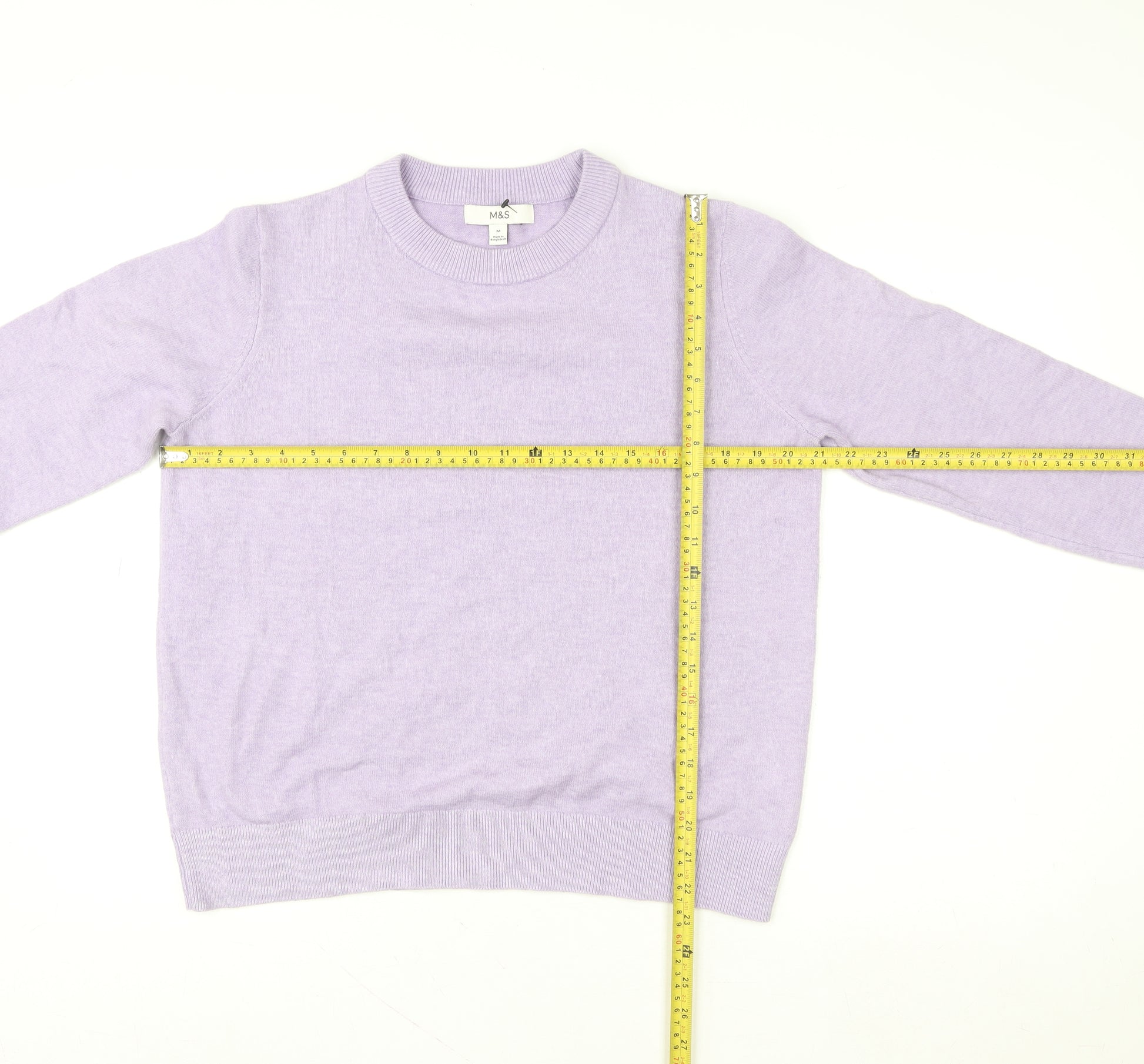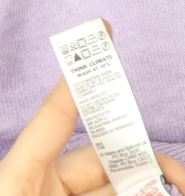 Refresh your wardrobe with this elegant women’s jumper from Marks and Spencer, designed in a soft and charming dusted lilac shade. Crafted from a comfortable blend of polyester, acrylic, elastane, and wool, this jumper offers a balance of warmth and lightness, making it suitable for year-round wear. The crew neck and long sleeves create a timeless silhouette, providing effortless style for both casual and smart-casual settings. Its tight-knit fabric ensures a smooth and refined finish, while maintaining comfort during cooler months. The easy-care design is machine washable, making it a low-maintenance yet stylish choice for everyday wear. Perfect for layering over shirts or under jackets, this versatile jumper transitions seamlessly from workwear to relaxed weekend looks. The regular fit allows comfortable movement without feeling bulky, while the ribbed trims at the collar, cuffs, and hem provide a neat, structured appearance. Ideal for pairing with jeans, trousers, or skirts, this piece embodies simplicity and sophistication. In excellent second-hand condition, it shows no visible wear or damage, ensuring continued quality and durability. Marks and Spencer’s reputation for reliability and comfort makes this jumper a wardrobe essential. The soft lilac hue flatters a variety of skin tones, adding a gentle pop of colour to your outfit without being overpowering. Whether dressing for work, a weekend outing, or a relaxed evening at home, this jumper delivers comfort, warmth, and timeless appeal. A perfect addition to any woman’s wardrobe seeking classic design with a touch of cosy luxury.