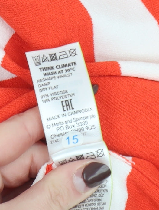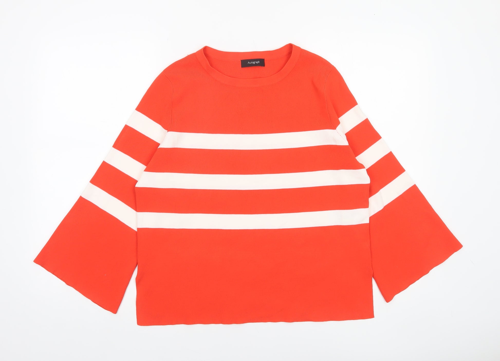Add a pop of colour to your wardrobe with this vibrant red and white striped jumper from Marks and Spencer’s Autograph collection. Designed for women who appreciate modern comfort and timeless style, this lightweight pullover delivers casual sophistication to any outfit. Crafted from a soft blend of 81% viscose and 19% polyester, the fabric provides both stretch and breathability, ensuring lasting comfort throughout the day without compromising on elegance. The jumper features a flattering crew neckline and relaxed fit, complemented by wide flared long sleeves that add a touch of modern flair. Its horizontal stripe design in red and white evokes a classic nautical charm while maintaining a crisp, contemporary appeal. Perfect for layering or wearing solo, this jumper transitions seamlessly between seasons — ideal for spring and autumn outings, or cool summer evenings. Pair it effortlessly with jeans, tailored trousers, or a sleek skirt for a polished, versatile look suitable for casual weekends, smart-casual workdays, or leisurely travel. The fine knit construction feels smooth against the skin, while the durable material blend helps maintain shape and colour wash after wash. This pre-loved item is in excellent condition with minimal signs of wear, reflecting quality craftsmanship and a well-maintained appearance. With its understated sophistication and flattering cut, this Marks and Spencer jumper offers an easy route to effortless everyday style. Refresh your wardrobe with a piece that balances comfort, durability, and elegance — a versatile choice that will quickly become a go-to staple for stylish layering and transitional dressing.