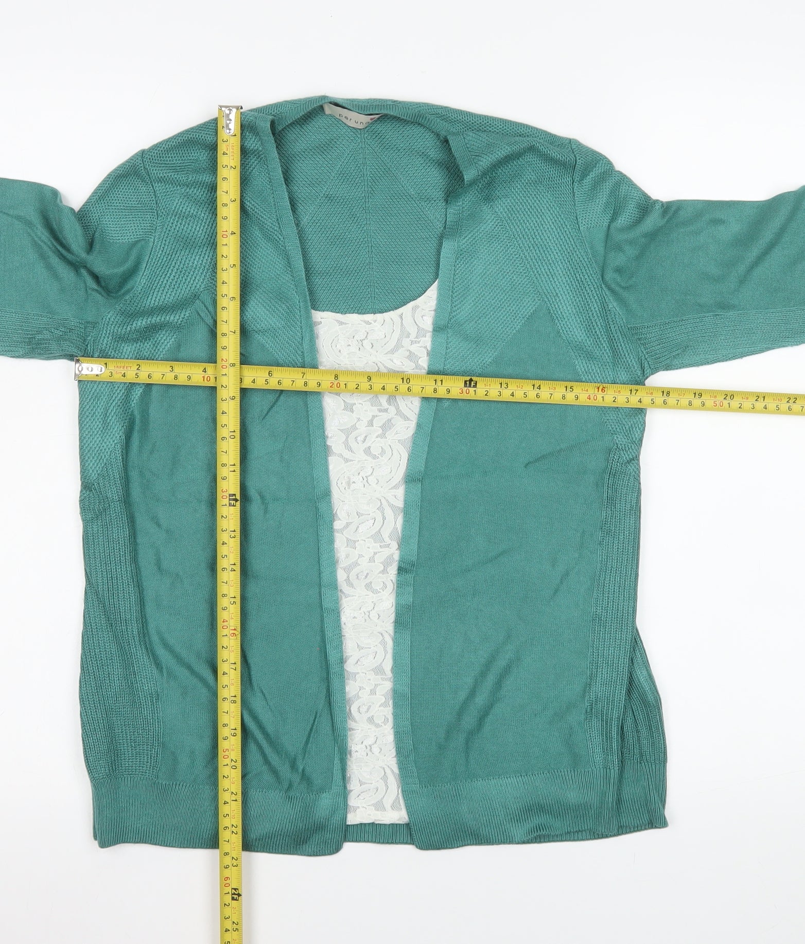 This elegant Marks and Spencer Women’s Sea Green Knit Tunic Cardigan in size 10 offers understated sophistication and comfort for everyday wear or smart casual occasions. Crafted from a breathable blend of acrylic and viscose with added polyamide and elastane for stretch, this lightweight piece ensures a soft and flexible fit that flatters the silhouette. The open front design makes it effortlessly layerable over tops and blouses, while the long sleeves provide warmth and coverage ideal for transitioning through seasons. The cardigan features a delicate white lace front lining made from 100% polyester, adding a subtle contrast and a touch of femininity to the overall design. The ribbed collar, cuffs, and hem lend structure to the relaxed silhouette, ensuring durability and style retention. The sea green hue brings a refreshing and versatile tone, making it easy to pair with neutral or bold colours alike. Perfect for workwear, casual outings, or layered weekend looks, this knit tunic cardigan adapts seamlessly to your wardrobe needs. In excellent condition with no visible flaws, this garment has been gently cared for and retains its original soft texture and vibrant colour. Ideal for year-round wear, particularly in spring, autumn, and cooler summer evenings, this versatile piece captures classic Marks and Spencer quality and comfort. Whether styled with jeans for everyday ease or dressed up over a blouse and tailored trousers, it’s a wardrobe essential that balances simplicity, charm, and sophistication beautifully.