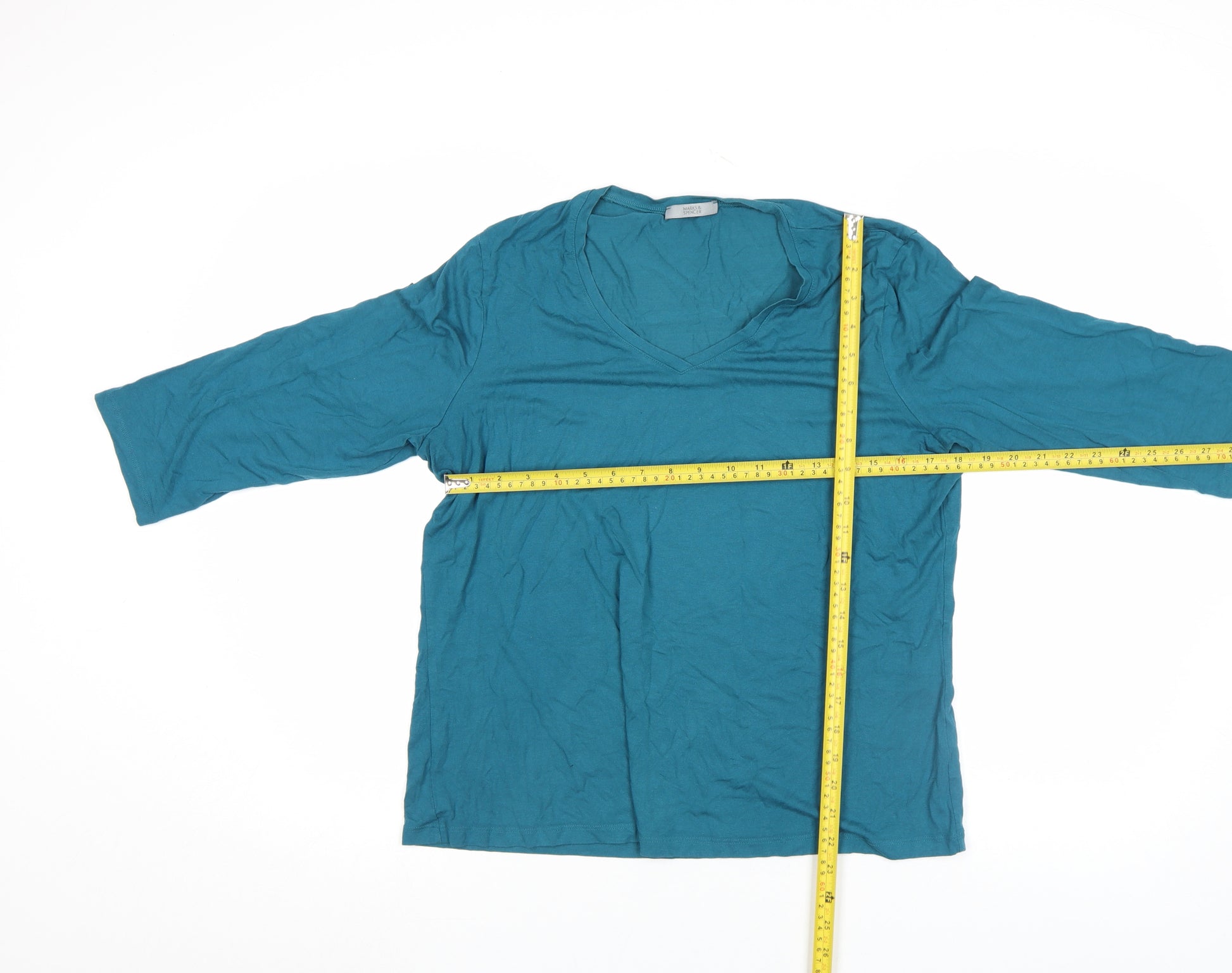 Upgrade your everyday wardrobe with this Marks and Spencer Women’s Teal 3/4 Sleeve V-Neck Top in size UK 20. Crafted from soft 100% cotton jersey fabric, this top offers lightweight, breathable comfort that’s ideal for daily wear. The flattering V-neckline and classic, fitted 3/4 sleeves make it a versatile piece that can be styled for both relaxed and smart-casual settings. Its solid teal blue colour adds a stylish pop while remaining easy to coordinate with your favourite jeans, skirts, or trousers. The regular fit ensures a comfortable yet flattering silhouette, while the pure cotton construction provides natural softness and durability, making it perfect for year-round use. This top is finished with simple detailing and a pullover design, allowing for easy wear. Marks and Spencer’s quality craftsmanship ensures this wardrobe essential remains a timeless staple for your casual outfits. Ideal for spring, summer, or autumn, this top transitions effortlessly from season to season. Pair it with denim jackets or light cardigans on cooler days or wear it alone in warmer weather. Its solid hue and uncomplicated design make it a reliable choice for relaxed weekends, everyday errands, or casual meet-ups. In excellent pre-owned condition, this top shows light general wear and some creasing from storage but remains fresh, clean, and ready to wear. Enjoy the classic comfort and dependable quality that Marks and Spencer is known for with this elegant yet simple jersey cotton tee. A perfect addition to any collection of everyday essentials, this top promises effortless comfort, versatility, and timeless appeal at an excellent value.