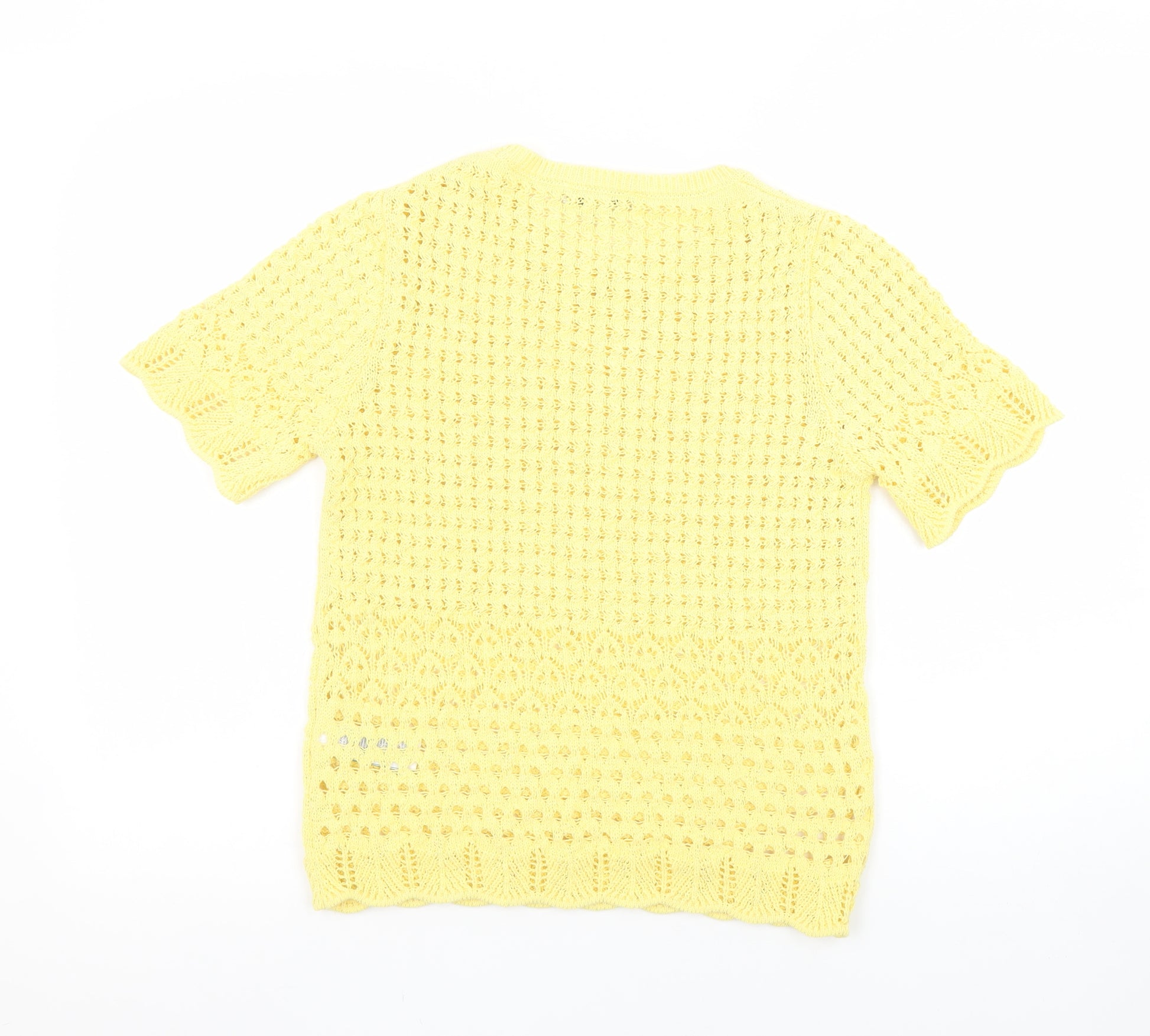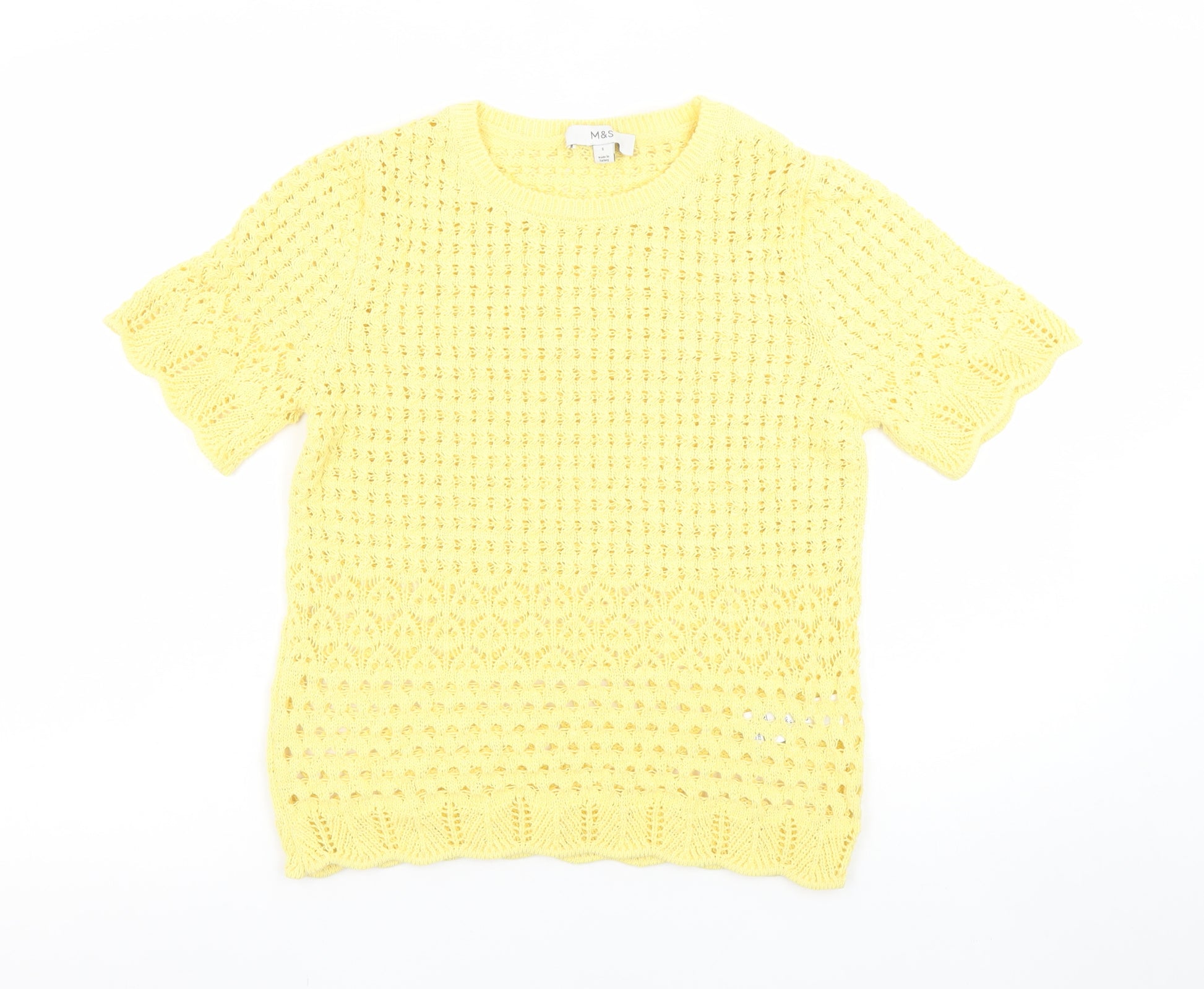 Brighten your wardrobe with this beautiful Marks and Spencer women’s yellow knit blouse. Crafted from a soft blend of polyester and cotton, this lightweight and breathable top feels comfortable while adding a cheerful splash of colour to your outfit. The intricate knit pattern creates a delicate crocheted effect, offering a touch of texture and elegance without compromising on casual wearability. Designed with a flattering regular fit, this blouse features a classic crew neckline and short flutter sleeves with scalloped edges, ideal for a feminine finish. The pullover style ensures easy dressing, while the stretch in the knit fabric moves naturally with you, keeping you stylish and comfortable from morning to evening. Perfect for warm-weather seasons, this airy yellow top can be paired effortlessly with everything from light denim to tailored skirts, making it a versatile piece in your wardrobe. The soft and breathable composition makes it well-suited for spring and summer wear, whether you are heading out for a casual lunch, exploring the weekend markets, or enjoying a sunny garden gathering. The combination of subtle detail and cheerful tone gives it a touch of timeless charm. This Marks and Spencer blouse remains in excellent condition with very light signs of previous wear and a clean overall appearance. Designed in a classic style that flatters many body types, it promises both quality and comfort as you would expect from the brand. Add this bright Buttercup yellow knit blouse to your collection today for a versatile, easy-to-style option that brings both warmth and elegance to your casual wardrobe.