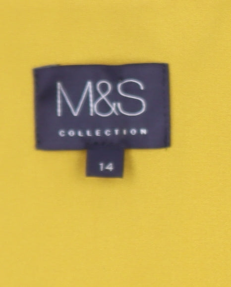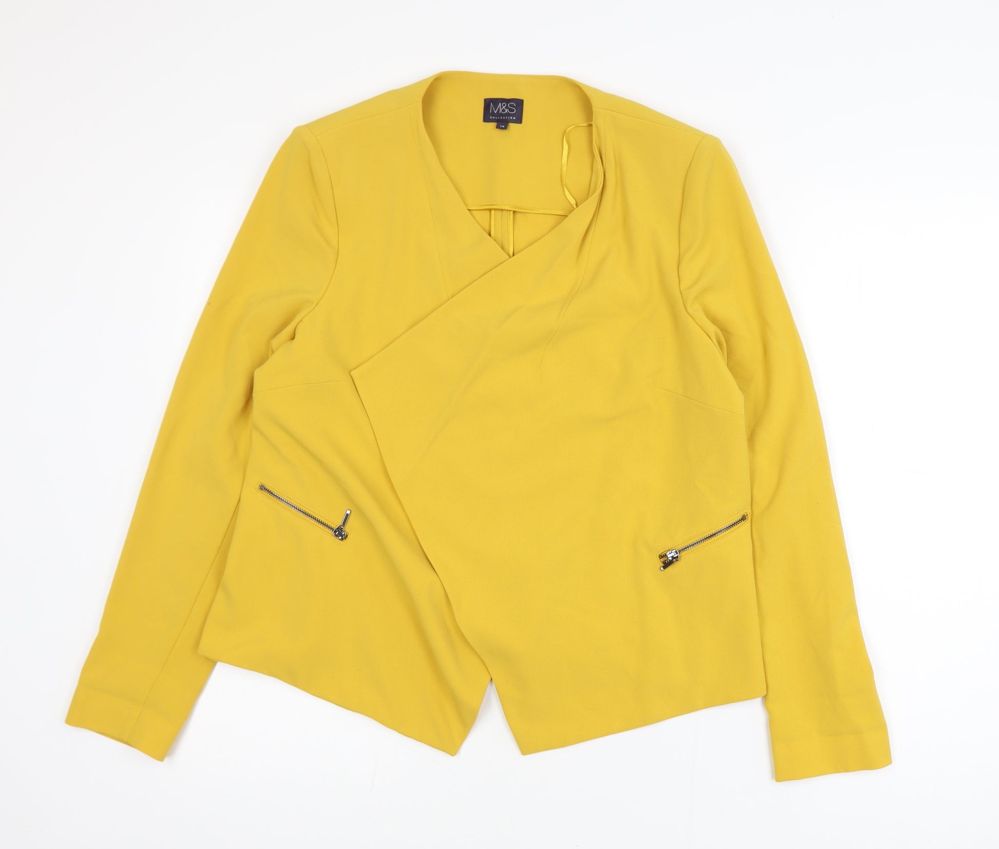 Enhance your professional wardrobe with this eye-catching yellow tailored blazer from Marks and Spencer. Designed as part of the M&S Collection, this women’s size 14 blazer brings a vibrant and modern touch to your business or casual look. Crafted from a smooth and durable woven fabric blend of polyester, viscose, and elastane, it delivers a comfortable stretch fit and soft feel without compromising its structured silhouette. The asymmetrical front design and zip pocket detailing provide a distinctive, fashion-forward edge, making it a versatile piece that pairs perfectly with skirts or trousers for a polished appearance. The regular-length cut and long sleeves maintain traditional elegance while offering everyday practicality. Ideal for spring and autumn wear, this lightweight jacket transitions effortlessly between work meetings and social occasions. The quality tailoring reflects Marks and Spencer’s longstanding reputation for refined style and durability, while the bright mustard-yellow tone adds a cheerful pop of colour to your outfit. Fully machine washable at 30°C, this blazer is designed for ease of care and longevity. Whether you’re dressing up for business engagements, casual lunches, or evening gatherings, this tailored piece provides a flattering fit that embodies both confidence and comfort. With its clean lines, minimalistic design, and contemporary mustard shade, it’s the perfect statement jacket for women who appreciate timeless style with a modern twist. Make every outfit stand out while maintaining elegance and sophistication with this exceptional Marks and Spencer blazer.