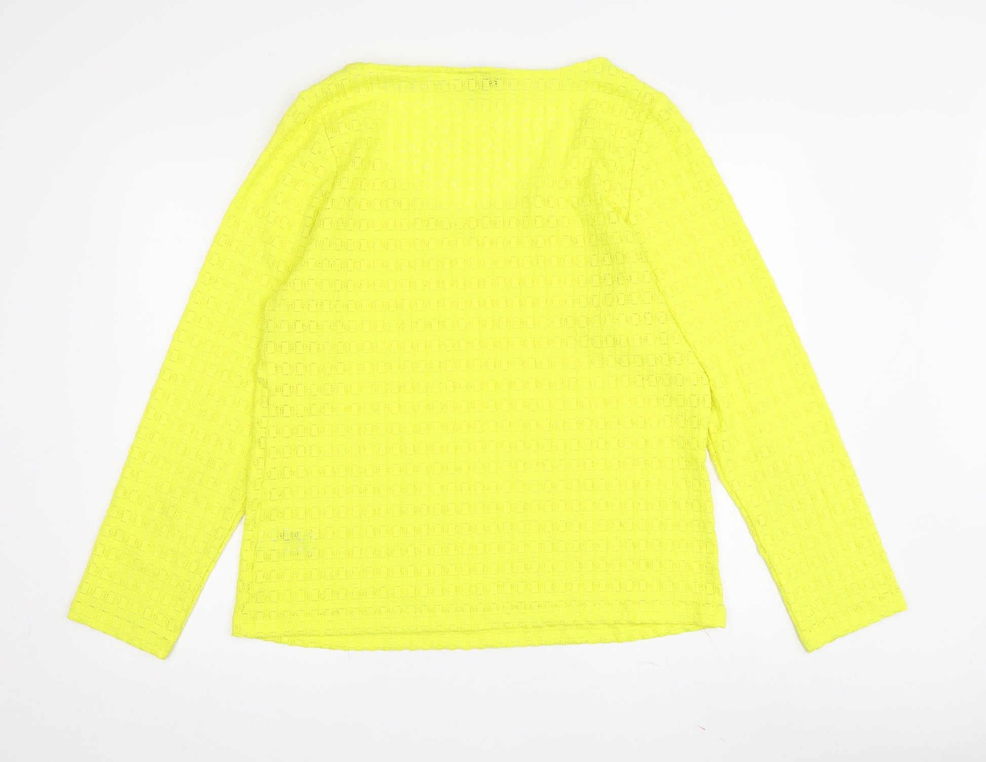 Brighten up your wardrobe with this vibrant yellow top from Marks and Spencer. Designed for women who love to stand out, this piece is crafted in a solid pattern with a scoop neckline that flatters your figure. The long sleeves add a touch of elegance, making it perfect for cooler days or layering. Made from a comfortable blend of polyester and elastane, this garment offers both durability and a hint of stretch for the perfect fit. Its machine washable care makes it easy to maintain, while the regular size cut ensures a classic silhouette for everyday wear. Although it lacks original sales tags, the top is in excellent condition, free from any visible damage. Whether you're dressing it up for a casual outing or keeping it simple for a day at home, this Marks and Spencer top is a versatile addition to any wardrobe. Grab this stylish and functional piece for just £7.50 today!