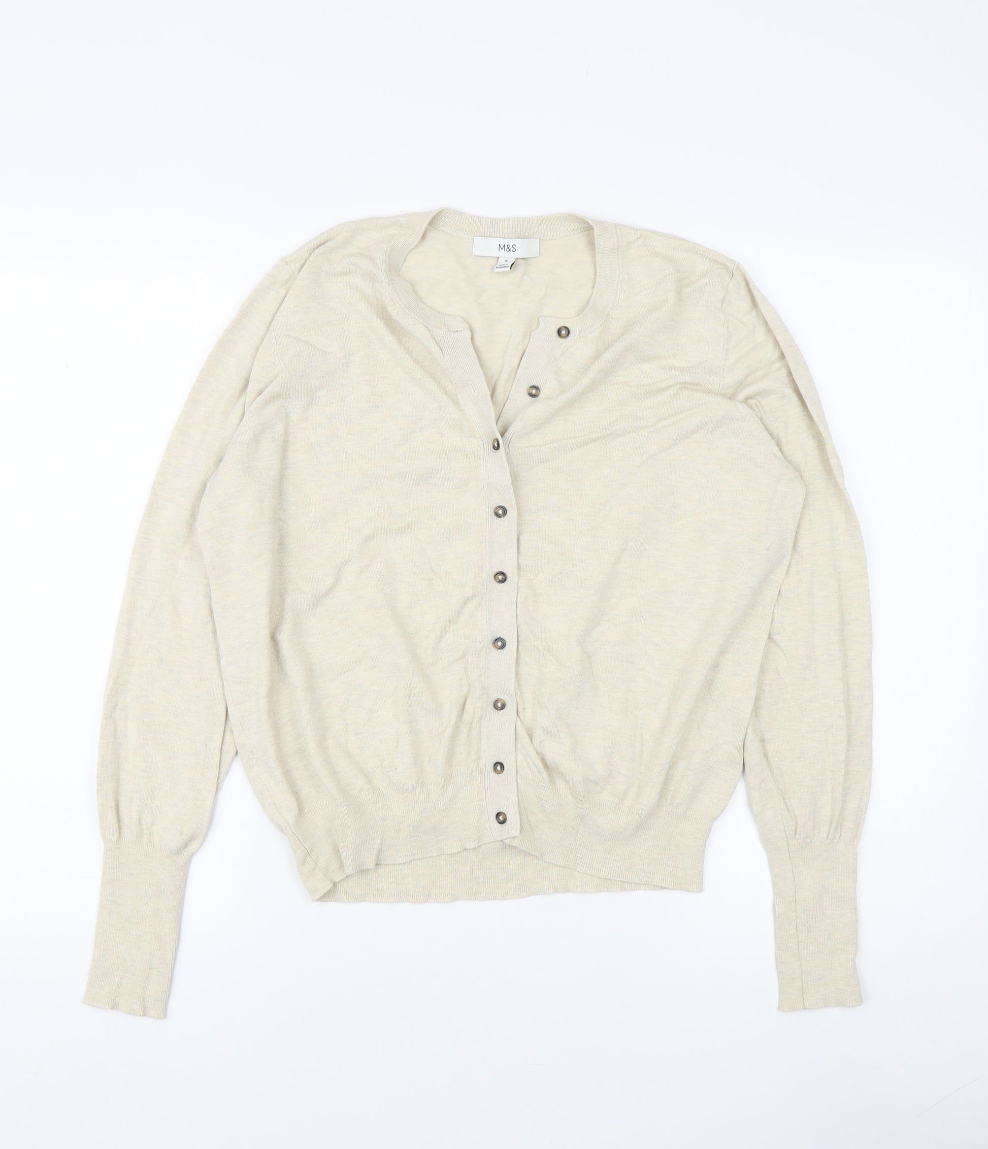 Elevate your wardrobe with this classic beige cardigan from Marks and Spencer, tailored for women seeking timeless style and comfort. Crafted in a regular fit, this cardigan is perfect for all seasons. Its round neck and button accents lend a classic touch, while the long sleeves ensure added warmth and coverage, making it ideal for casual occasions. The cardigan is presented in a versatile beige hue, effortlessly pairing with any outfit. Add this timeless piece to your collection for an effortlessly chic look year-round.