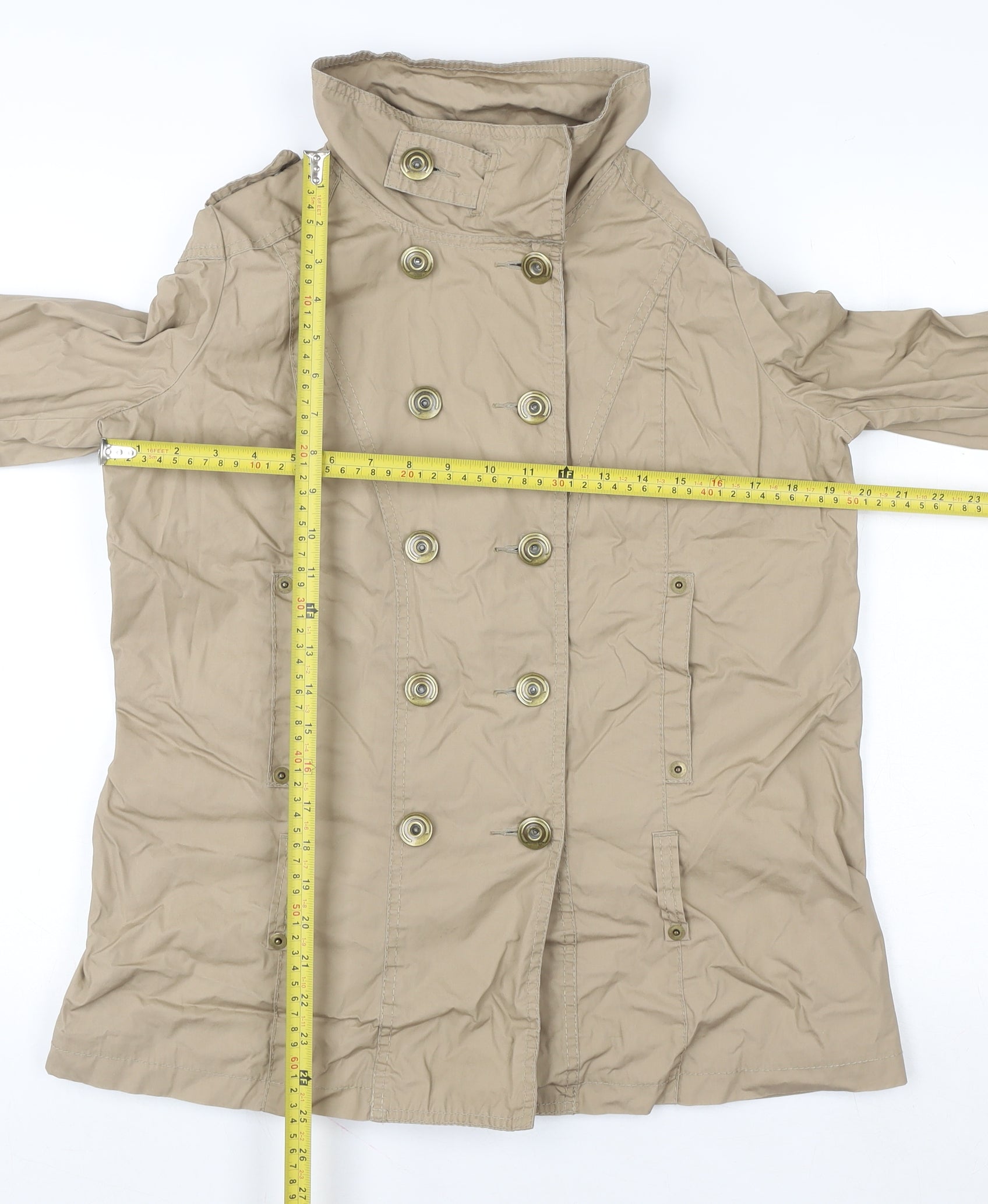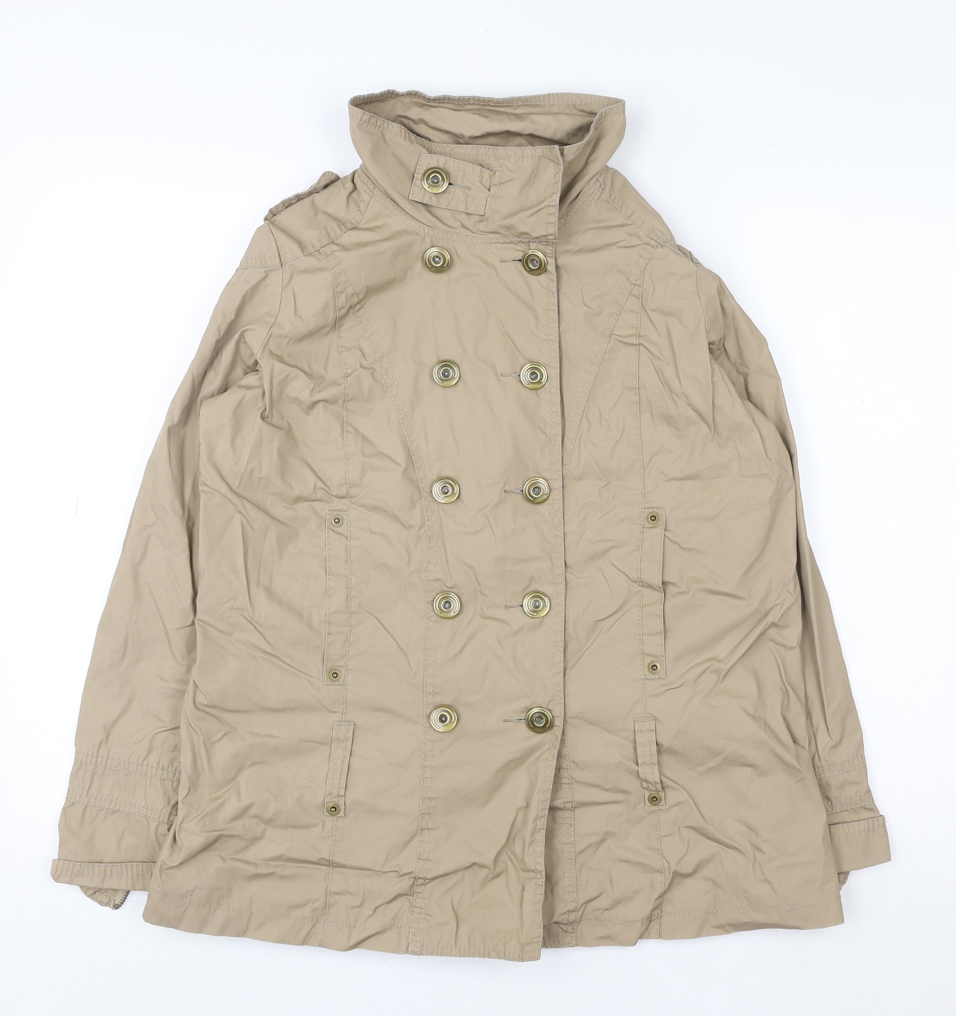 This Marks and Spencer women's beige trench coat in size UK 14 offers timeless style combined with practicality and comfort. Crafted from 100% cotton, the outer shell provides a soft yet structured look, ideal for transitional seasons like spring and autumn. The coat features a classic double-breasted front with button fastening, giving it a sophisticated and versatile appeal suitable for both casual outings and light business wear. The mid-length cut ensures flattering coverage while maintaining an elegant silhouette, making it perfect for layering over everyday or chic wardrobe pieces. Designed for functionality as well as style, the coat includes two front button-secured pockets and neat sleeve detailing. The inner lining is made from a cotton and polyester blend to enhance comfort and durability while giving the piece a premium finish. With its neutral beige tone, this trench coat complements virtually any outfit, making it a wardrobe essential for effortless pairing with jeans, skirts, or dresses. The high collar can be styled up or down for added versatility and weather protection. The lightweight twill fabric ensures a breathable yet sturdy wear, suitable for brisk autumn mornings or cool spring days. Its regular fit allows for layering without feeling bulky, and the tailored structure accentuates a polished, feminine silhouette. This coat remains in excellent pre-owned condition with light signs of wear and minor creasing that do not detract from its stylish appeal. Marks and Spencer’s quality craftsmanship is evident in its attention to detail and durable construction, ensuring longevity and timeless charm. Ideal for women seeking a dependable, stylish outerwear staple, this trench coat provides everyday elegance that easily transitions from workwear to weekend outings.