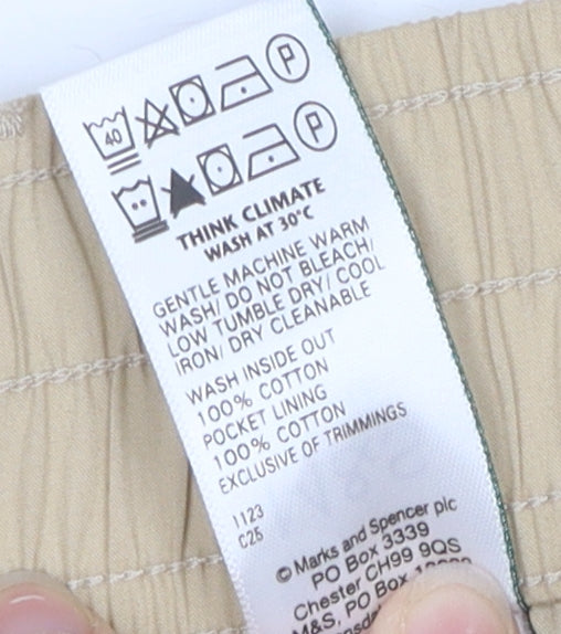 Discover comfort and simplicity with these Marks and Spencer women's beige cropped trousers. Ideal for casual outings, these trousers feature a relaxing elastic waistband for easy wear. Made from 100% cotton, they're perfect for maintaining a cool, breathable feel throughout the day. The flat front design ensures a smooth silhouette, making them versatile to pair with a variety of tops. Although they're in excellent condition, the fabric displays natural wrinkles, adding a touch of effortless chic to your look. Perfect for enjoying laid-back moments or running errands, these trousers are a staple for any wardrobe. Note the absence of visible tags, indicating their premium condition without being brand new. Embrace understated style with these comfortable and chic cropped trousers, a fine example of Marks and Spencer's dedication to quality and simplicity. Add this versatile piece to your collection for a practical and stylish addition to your everyday attire.