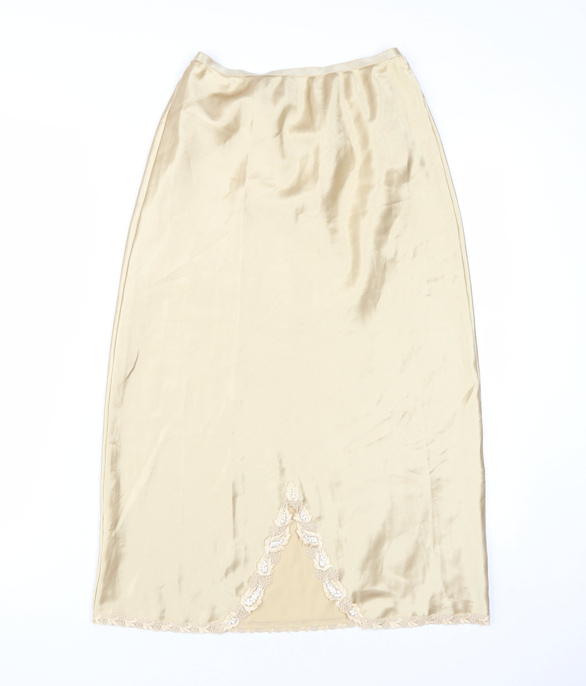 Embrace elegance with this exquisite beige midi skirt from Marks and Spencer, designed for the discerning woman. Crafted with a soft satin finish, the skirt embodies sophistication and comfort, perfect for both casual outings and smart-casual affairs. The elastic waist ensures a snug yet comfortable fit, enhancing your silhouette while providing easy wearability. Accentuated with delicate lace detailing, it lends a touch of femininity that elevates its overall appeal. The straight pencil style offers a timeless look that flatters every figure, making it a versatile addition to any wardrobe. Pair it with a chic blouse or a simple tee to capture an effortlessly stylish ensemble. Made from durable polyester, it promises easy care without sacrificing elegance. Seamlessly transition from day to evening wear with this versatile piece that celebrates classic fashion and contemporary convenience.