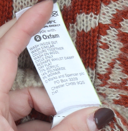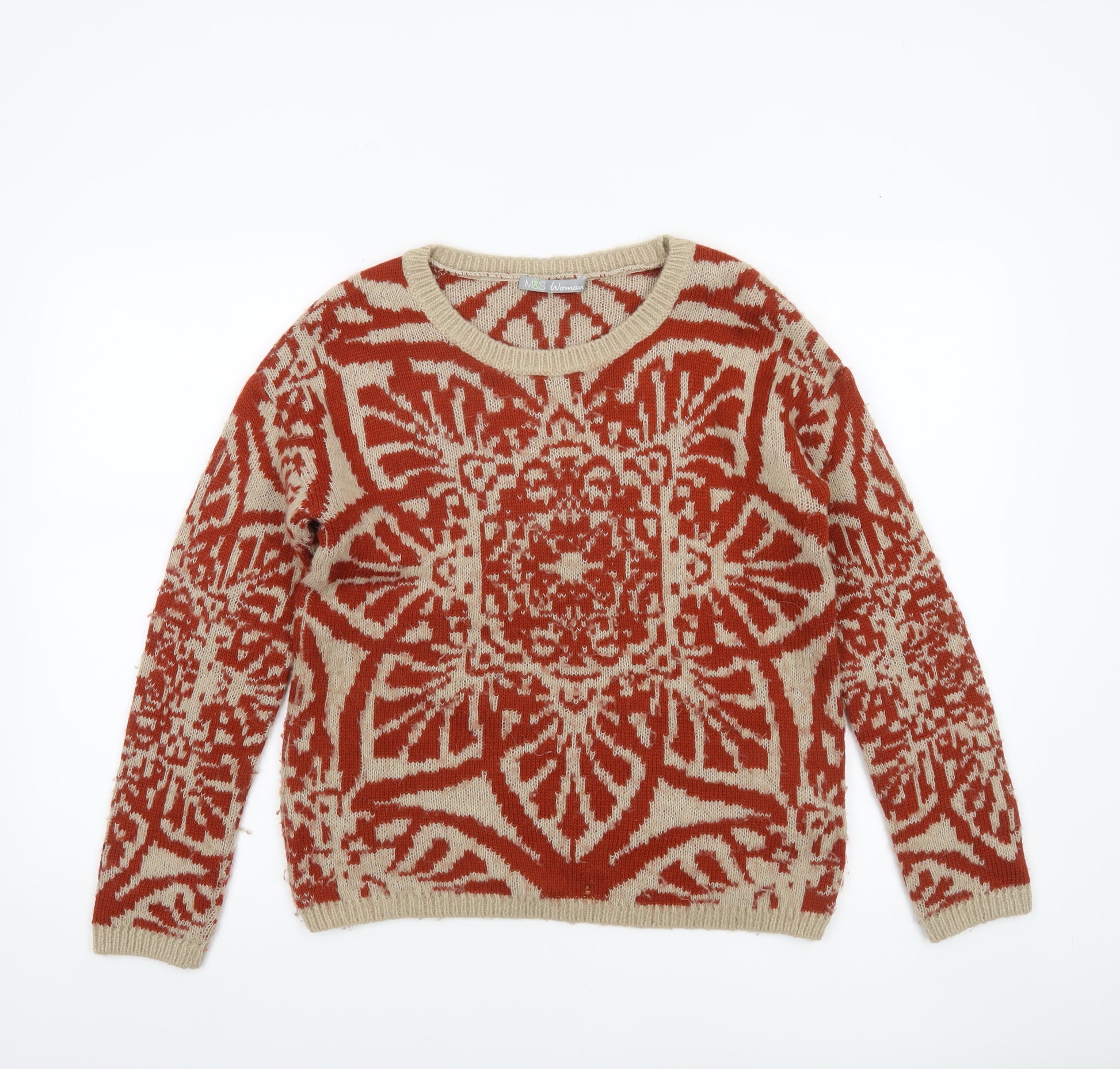 Add a touch of modern bohemian charm to your wardrobe with this beautiful Marks and Spencer women’s jumper. Crafted in a unique beige and deep red geometric pattern, this pullover sweater effortlessly combines classic design with a contemporary twist. The crew neck and long sleeves make it an ideal choice for layering or wearing on its own during the cooler months. Knitted from a premium blend of 77% acrylic, 14% polyamide, and 9% mohair, this knit offers a soft, warm, and lightweight feel for all-day comfort. The mohair component enhances the texture, providing extra warmth and a subtle luxurious touch to the overall finish. Designed in Turkey to the high quality standards Marks and Spencer is known for, this size 8 jumper ensures a comfortable regular fit suitable for casual wear or smart layering. Perfect for autumn and winter seasons, this piece pairs beautifully with jeans, tailored trousers, or skirts for a versatile look that transitions easily from day to evening wear. The bold geometric design gives it a statement appeal while maintaining an understated elegance that complements any style. In excellent pre-owned condition with light signs of wear and no visible faults, this jumper delivers both durability and style. Easy to care for and machine washable, it’s made for women who appreciate effortless sophistication and practicality. Refresh your knitwear collection with this timeless piece that embodies comfort, personality, and versatility—ideal for casual days, relaxed evenings, or weekend outings.