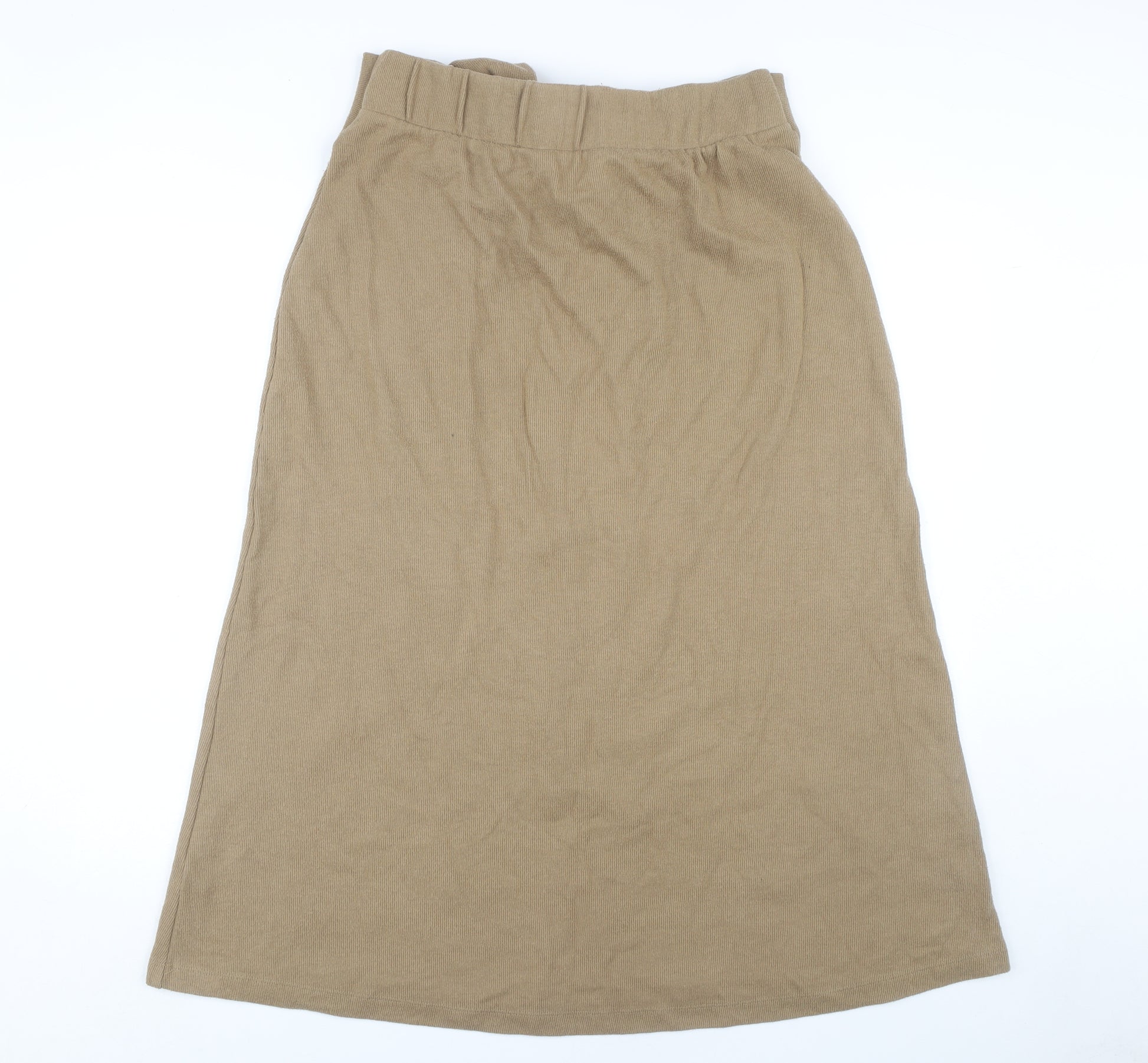 This elegant beige skirt by Marks and Spencer is crafted for the modern woman. Made from a blend of polyester and cotton, it offers a comfortable and relaxed fit. Featuring an elastic waist for versatile styling, this skirt is both chic and practical. Designed in a neutral beige tone, it can effortlessly match various outfits. Ideal for casual occasions, it aligns with your everyday needs while maintaining a fashionable edge. Machine washable fabric ensures easy care and longevity. Impressively versatile, this skirt suits all seasons, promising year-round style. Its unpatterned, knit fabric delivers a classic look, suitable for numerous settings. Although in excellent condition, it lacks original sales tags, adding to its affordable charm. The perfect addition to your wardrobe, offering a blend of comfort and enduring style.