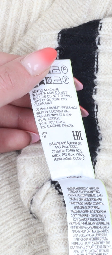 Stay cosy and stylish with this Marks and Spencer Women's Beige Striped Pullover Hoodie. Designed for casual comfort, this jumper features a classic cable-knit style with a modern twist, complemented by bold black stripes. Perfect for the chilly autumn and winter seasons, its acrylic blend fabric ensures both warmth and flexibility. The hoodie is equipped with a practical drawstring hood and has a comfortable regular fit. Its machine-washable material makes it an easy-care piece for your wardrobe. Whether you're going for a laid-back look or need something cosy for a casual day out, this jumper is your go-to choice. Ideal for pairing with jeans or leggings, it offers a versatile addition to your clothing collection.