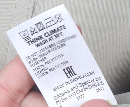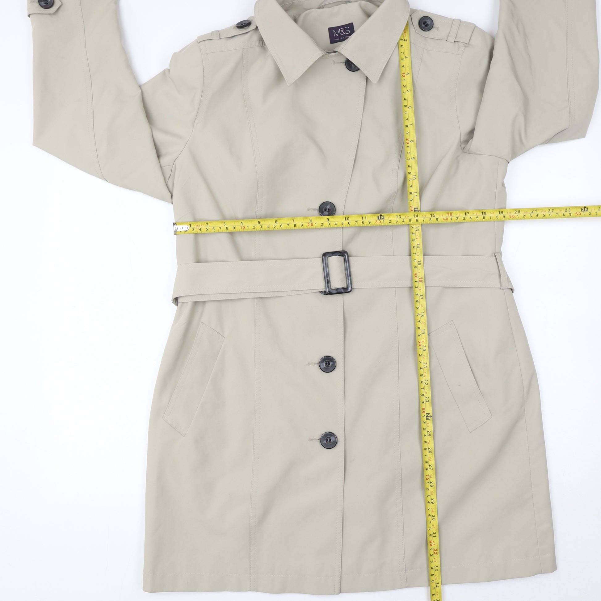 Embrace timeless sophistication with this elegant beige trench coat from Marks and Spencer, designed specifically for women who value both style and practicality. Crafted from durable, high-quality polyester with a smooth twill texture, this coat offers a flattering and structured silhouette that never goes out of fashion. The mid-length design makes it ideal for layering during the transitional seasons of autumn and spring, effortlessly completing both business and casual looks. This stylish trench coat features a classic belted waist that enhances your figure while providing an adjustable fit for optimal comfort. The double-stitched seams and button fastening lend a refined finish, while the matching belt buckle accents add a touch of polish. The coat includes two convenient front pockets, perfect for keeping your hands warm or storing small essentials on the go. Inside, the coat is fully lined with soft polyester, ensuring comfort and a smooth fit over any outfit.The neutral beige shade allows for easy pairing with almost any wardrobe colour palette, whether you are styling it with jeans and trainers for an off-duty look or pairing it with workwear for a professional ensemble. It's also designed with a structured collar for a tailored feel that makes it suitable for both day and evening wear.Although gently used, this coat remains in very good condition, with only a light mark near the pocket that does not detract from its overall appeal. The high-quality craftsmanship typical of Marks and Spencer ensures a long-lasting and reliable outerwear piece that promises to stand up to everyday wear while keeping you looking effortlessly chic.Perfect for travel, commuting, or casual outings, this classic trench coat truly encapsulates the essence of versatile British style. Make it your next wardrobe staple and enjoy the comfort, quality, and timeless design that Marks and Spencer is known for.