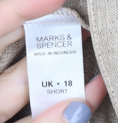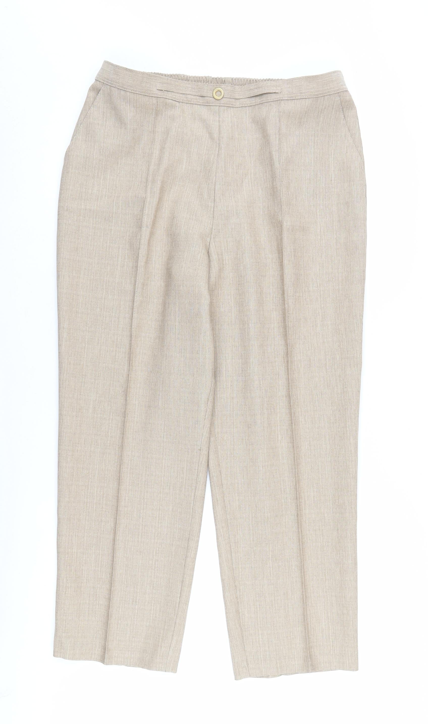 Elevate your wardrobe with these stylish beige trousers from Marks and Spencer, perfect for both casual outings and office settings. Crafted for women with a size fitting of 18, these trousers offer comfort and freedom of movement with their relaxed fit and straight leg style. The elastic waist ensures a secure and comfortable fit, while the pleated front adds a touch of sophistication. Made from 100% polyester, these trousers are lightweight and breathable, making them ideal for warmer spring and summer months. The neutral beige colour makes them versatile, easily paired with a variety of tops and shoes. These trousers feature a chic button accent and are designed with convenience in mind, being machine washable for easy care. Whether dressing for work or a casual day out, these trousers are a practical and stylish choice for any wardrobe.