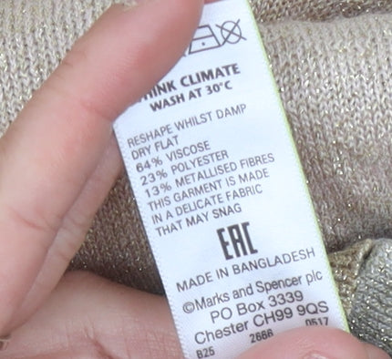 Discover effortless elegance with this Marks and Spencer Women's Cardigan in a versatile beige shade. Crafted with a blend of viscose, polyester, and metallic fibre, this lightweight knit offers both comfort and a hint of sparkle. The classic V-neck design is accented with stylish buttons, making it suitable for a variety of occasions, from casual outings to relaxed office environments. This medium-sized cardigan, catering to regular fit, allows for a flattering silhouette that's ideal for layering. Its long sleeves and all-season suitability make it a practical addition to any wardrobe, while its machine washable nature ensures easy care. Whether you're dressing up for a laid-back gathering or adding a touch of sophistication to your everyday look, this cardigan has you covered. An essential piece from the trusted Marks and Spencer brand, this cardigan promises quality and style, perfect for any fashion-forward woman.