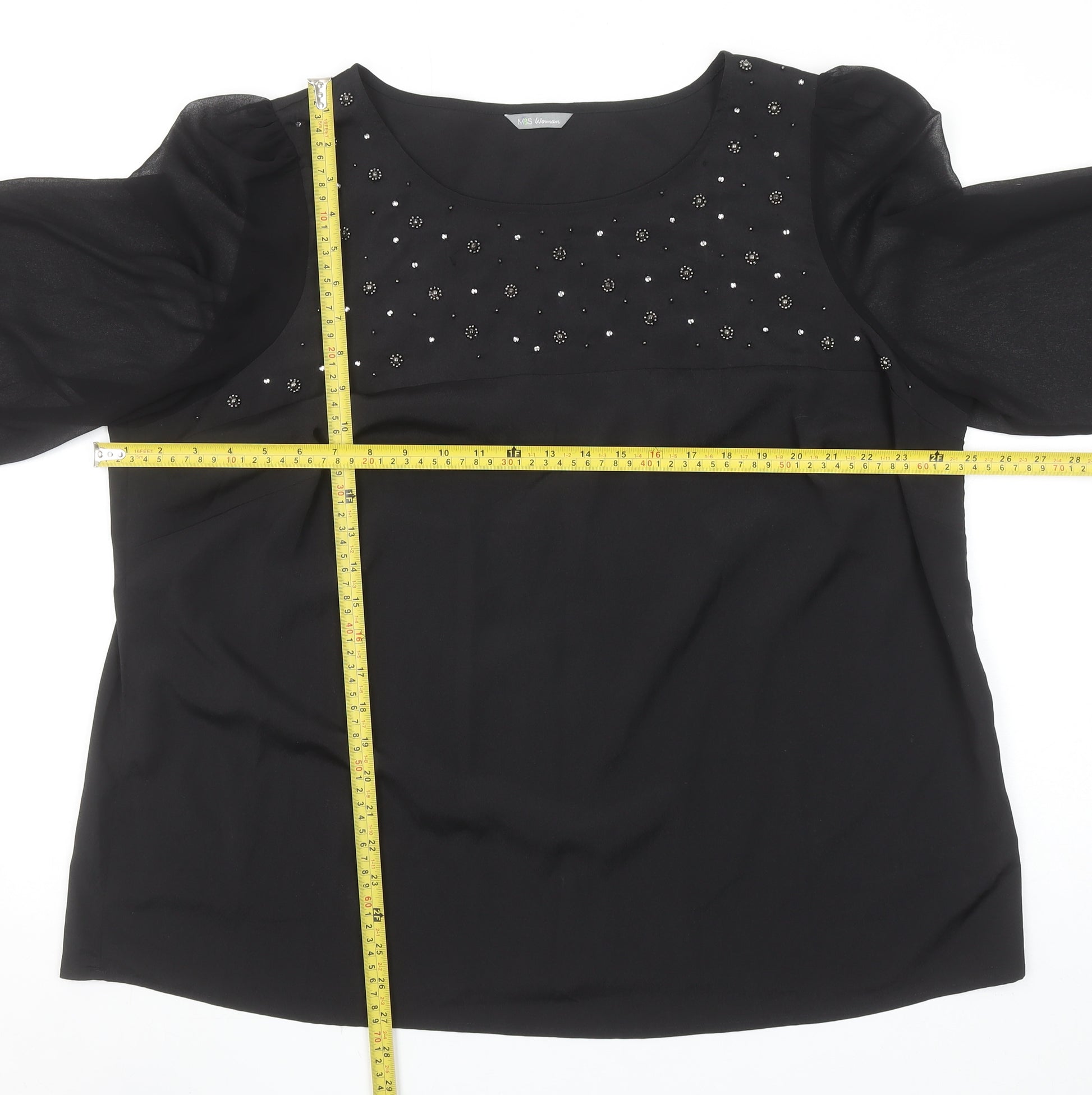 Elevate your wardrobe with this elegant Marks and Spencer women's black blouse, designed for timeless sophistication. Crafted from a lightweight polyester chiffon fabric, it offers a luxurious drape and airy comfort, ideal for special occasions or evenings out. The round neckline is adorned with intricate beaded detailing that catches the light for a touch of subtle glamour, while the 3/4 length puff sleeves create a softly romantic silhouette. The relaxed fit ensures ease of movement and a flattering line, perfect for pairing with tailored trousers or sleek skirts. Designed in the UK and made in India, this piece reflects thoughtful craftsmanship and classic styling. Versatile and graceful, this Marks and Spencer blouse transitions effortlessly from day to night, making it a must-have addition to your collection. Its soft yet resilient polyester blend makes it durable and easy to care for, guaranteeing long-lasting elegance. Ideal for both casual gatherings and semi-formal events, this black top embodies understated refinement with just the right amount of sparkle, ensuring you shine effortlessly wherever you go.