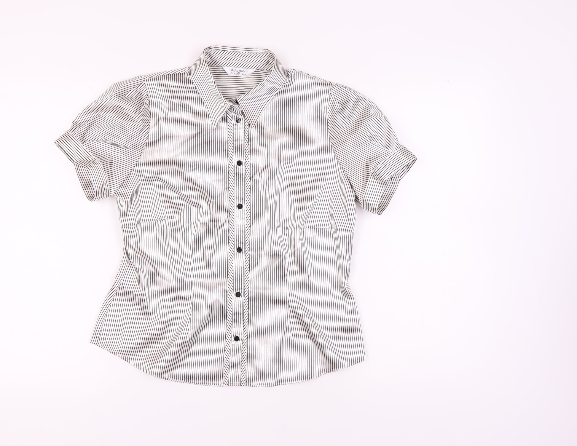 This elegant Marks and Spencer button-up shirt in a versatile black mix is ideal for any fashion-forward wardrobe. Designed for women, this top combines classic sensibility with modern appeal, effortlessly transitioning from formal business meetings to casual outings. Made from a soft blend of 93% polyester and 7% elastane, it offers maximum comfort and durability. Sporting a stylish striped pattern, alongside a chic collared neckline, this shirt elevates everyday looks with ease. The short sleeves and button accents add a touch of sophistication, while its regular fit and easy-care fabric make it a fuss-free choice. Perfect for all seasons, this piece will be your go-to for both business and casual occasions alike. Despite its very good condition, it has no visible signs of wear, offering great value for money. An essential addition for anyone seeking a blend of style and practicality in their wardrobe. Elevate your ensemble today with this timeless piece.