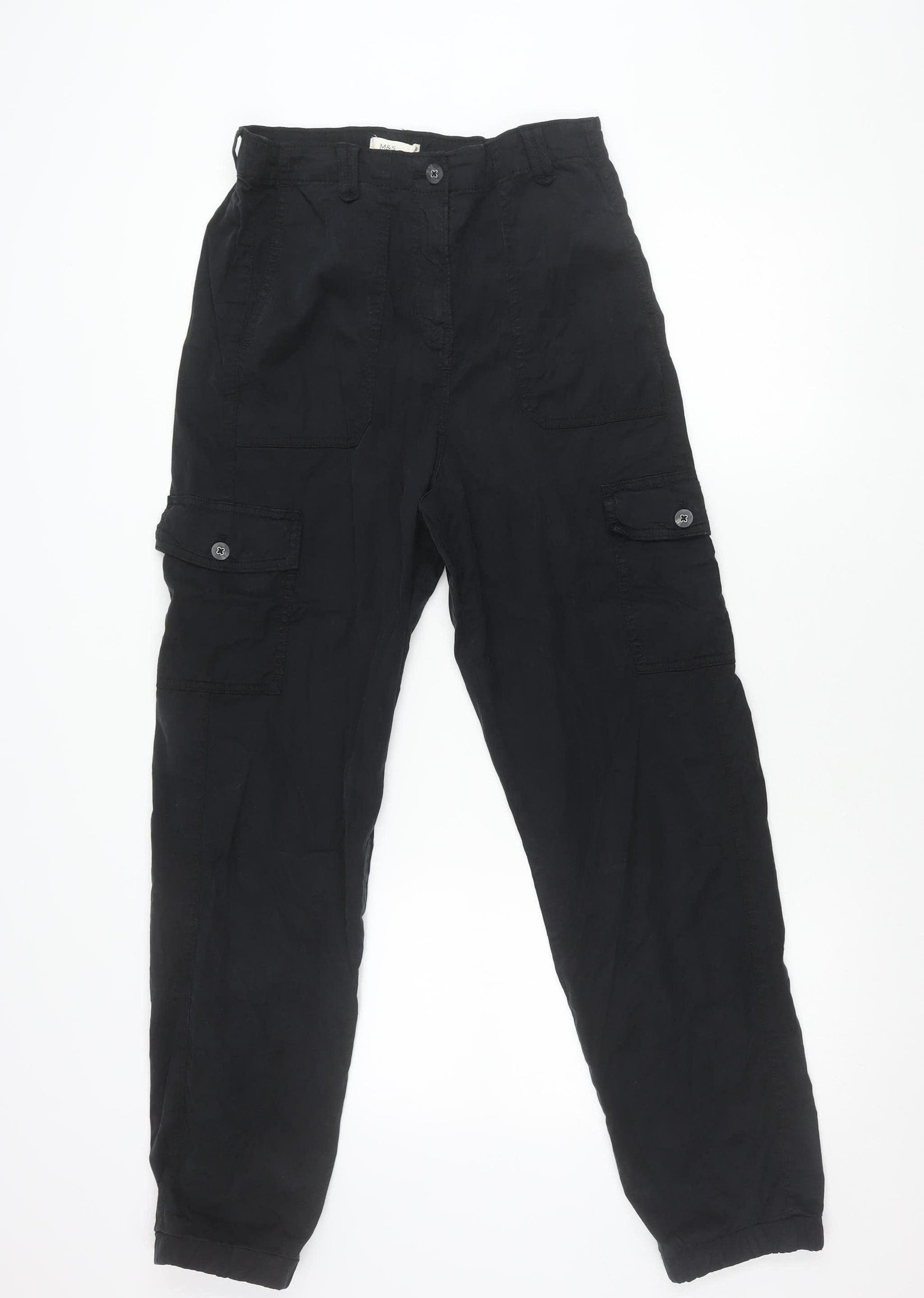 Step into comfort and style with these women's black cargo trousers from Marks and Spencer, perfect for casual wear and travel. Designed in a regular fit with a flattering mid-rise waist, these versatile straight-leg trousers feature a breathable and comfortable blend of 88% cotton, 10% polyamide, and 2% elastane, ensuring both durability and ease of movement. The trousers are finished with practical side and cargo pockets, giving them a functional yet fashionable appeal, ideal for everyday errands or adventurous days out. The elasticated waist enhances wearing comfort, making them easy to slip on while providing flexibility for all-day wear.These trousers come in a solid black colourway, making them a must-have staple for any woman's wardrobe. The crisp, flat front design coupled with a handy zip and button closure ensures a neat, sleek silhouette, while the absence of patterns allows for endless styling possibilities. Whether paired with a cosy jumper for a laid-back weekend or a shirt for a smart-casual look, these trousers adapt effortlessly to your needs.Suitable for the warmer months of spring and summer, their lightweight fabrication and breathable qualities keep you cool and comfortable. The robust cotton-rich fabric ensures long-lasting wear while maintaining softness against the skin. The straight-leg cut provides a timeless style that flatters different body shapes, offering both comfort and a polished appearance.With an inside leg of 31 inches, these trousers provide a balanced length that works with a variety of footwear, from trainers to boots. In excellent pre-loved condition, they show only light signs of wear with no visible flaws, making them a great-value choice without compromising quality.Ideal for women seeking a mix of practicality and style, these Marks and Spencer cargo trousers are both a wardrobe essential and a versatile statement piece. Add functionality, comfort, and understated style to your clothing collection with these easy-to-wear, timeless black cargo trousers.