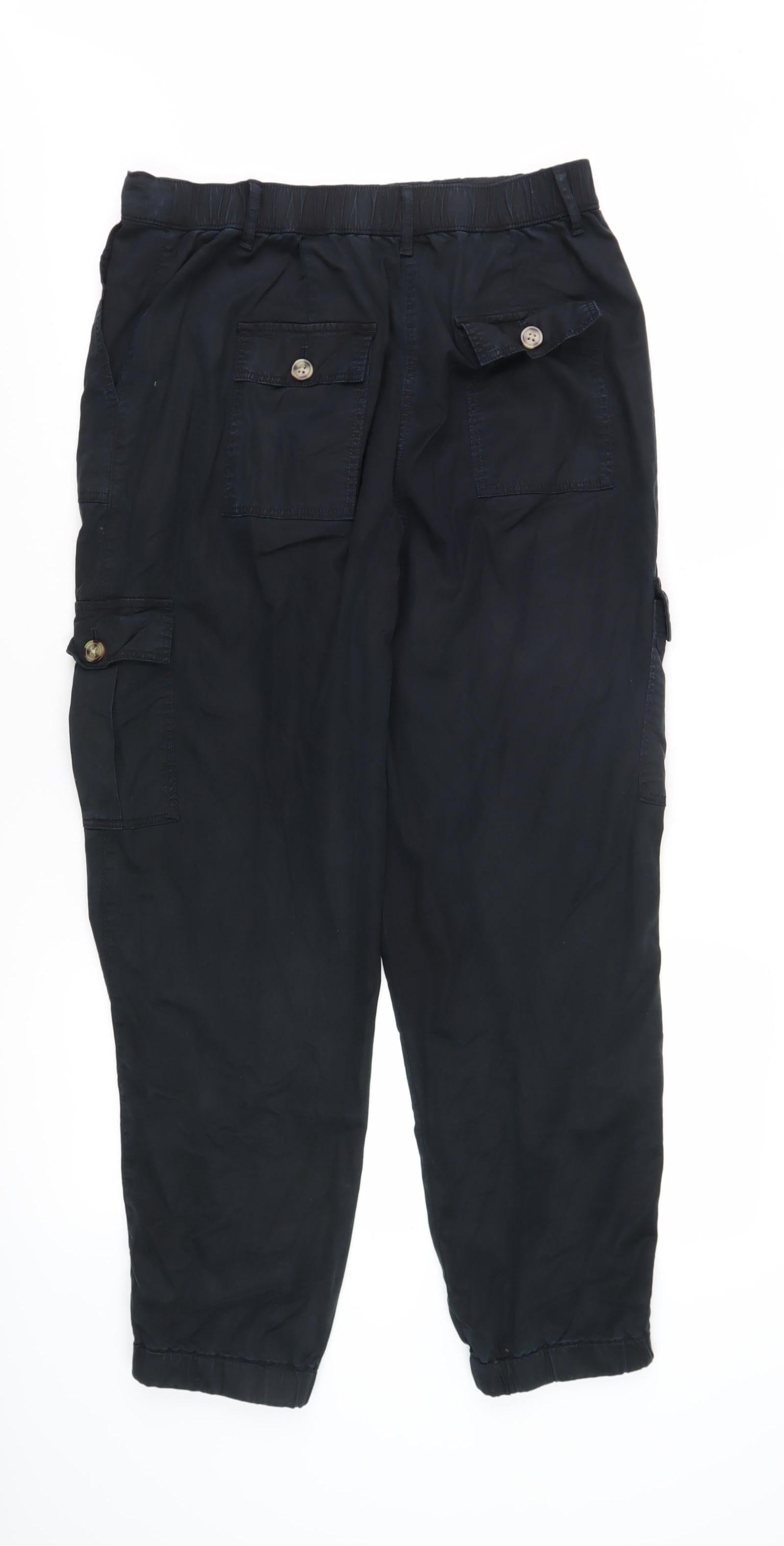 These classic black cargo trousers from Marks and Spencer are a versatile addition to any wardrobe. Tailored for women, they feature a comfortable regular fit and a mid-rise, making them ideal for a variety of occasions such as casual outings, travel, or workwear. Crafted from a durable cotton blend with a touch of elastane, these trousers ensure both comfort and a flattering silhouette. Equipped with multiple pockets and an elastic waist, they offer practicality without compromising on style. Ideal for the autumn and spring seasons, these trousers combine functionality and fashion effortlessly.