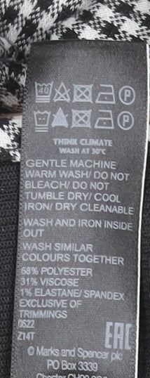 Add a timeless touch to your everyday wardrobe with these stylish Marks and Spencer women’s black check ankle-length leggings in size 10. Designed for comfort, these pull-on leggings combine the ease of classic legwear with a refined check pattern that offers a smart yet effortless look. The fine black and white check pattern provides a versatile style that transitions seamlessly from work to weekend wear. Crafted from a high-quality blend of polyester, viscose, and elastane, they offer a soft, stretchy fit that contours beautifully to your shape while maintaining a sleek, flattering appearance. The fabric is comfortable, breathable, and perfect for all-day wear, whether you’re working in the office, running errands, or enjoying a casual outing. Featuring a mid-rise waist with an elasticated band, these leggings provide a secure yet flexible fit that ensures maximum comfort. The zip pocket detailing on the front gives an elegant and practical finish, adding a touch of sophistication to their versatile design. Perfect for pairing with tunics, oversized knits, or tailored blouses, these leggings can easily be styled for both smart and relaxed occasions. The short leg length complements petite frames and helps achieve a neatly cropped silhouette ideal for boots, flats, or heels. Easy to care for, these leggings are machine washable and designed to last while maintaining their shape and style. Ideal for autumn and winter seasons, they are a must-have staple for any wardrobe seeking a smart-casual balance. In excellent condition with minimal signs of wear, these Marks and Spencer leggings combine comfort, style, and quality craftsmanship, making them an excellent wardrobe addition for women who appreciate British classic modern wear. Add them to your rotation for dependable everyday style that always looks effortlessly polished.