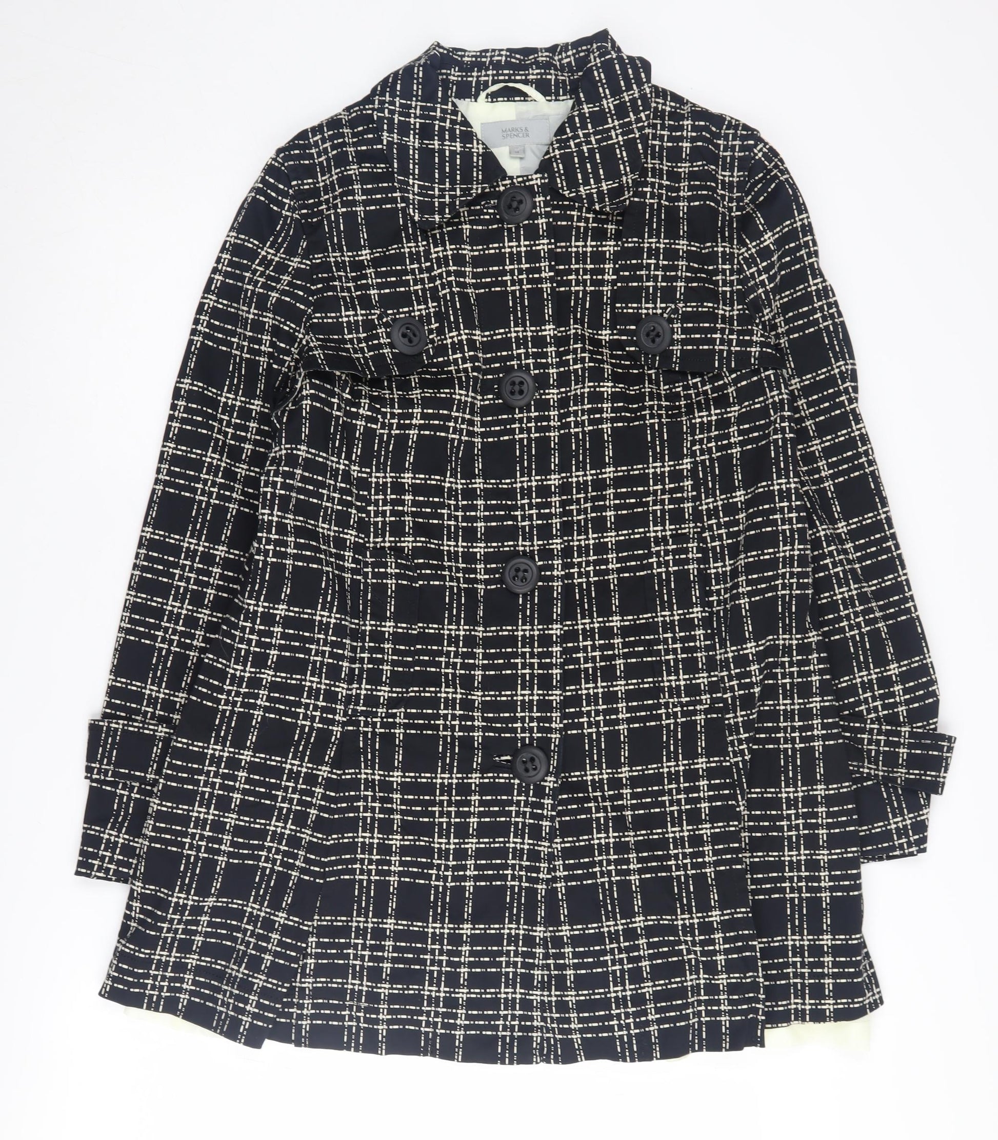 Elevate your wardrobe with this classic Marks and Spencer black check pea coat, perfect for the autumn and winter seasons. Tailored in size 14 for a regular fit, this coat boasts a stylish button accent and a timeless check pattern, ensuring you stay both warm and fashionable. Crafted from a blend of cotton and elastane, it offers comfort and a subtle stretch, while the polyester lining provides added insulation. Ideal for casual occasions, its single-breasted design ensures a sleek silhouette. A versatile choice for women looking to enhance their outerwear collection. Lightly worn but in excellent condition, this coat is both machine washable for easy care and guaranteed to keep you looking chic.
