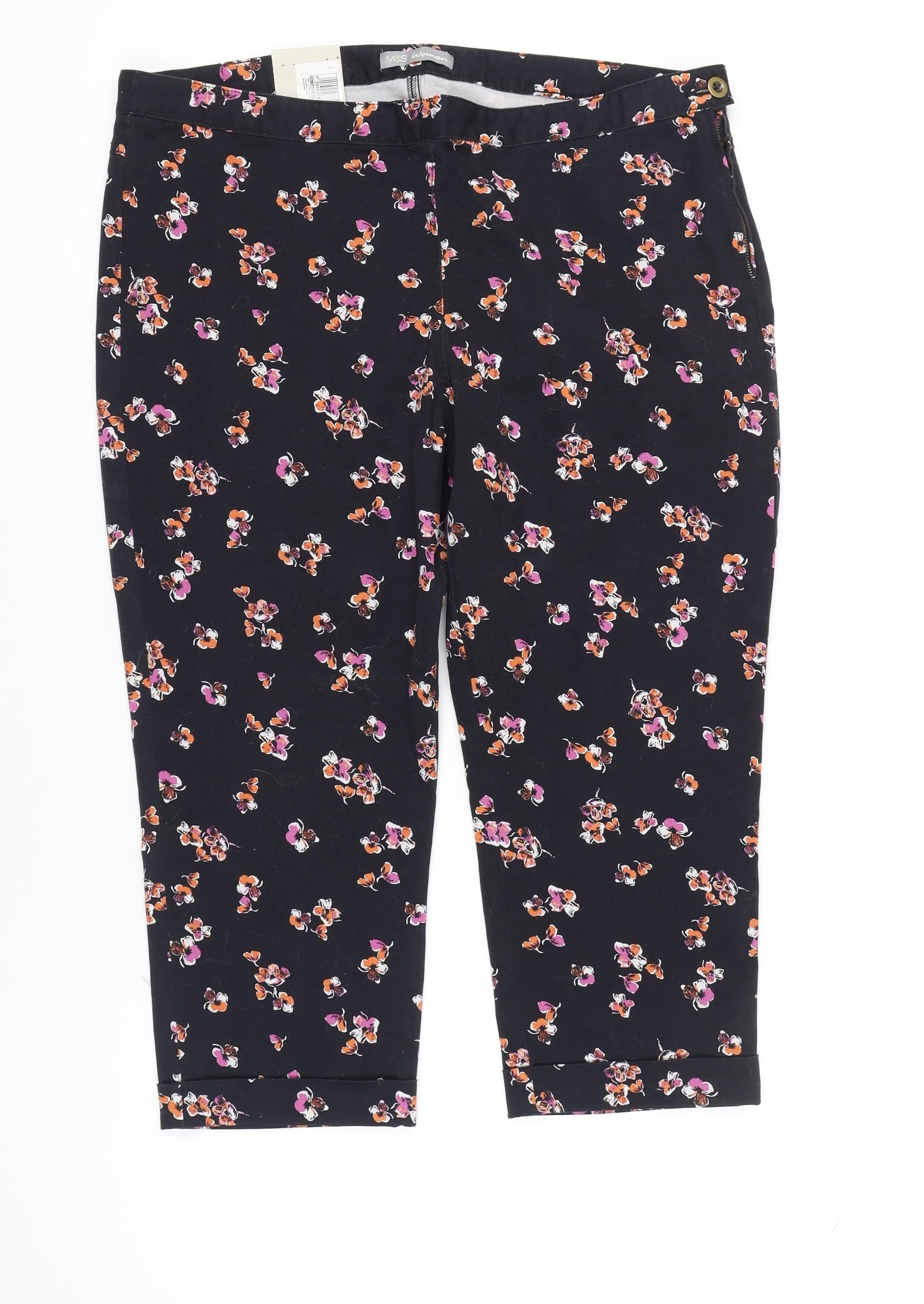 Enhance your casual wardrobe with these charming women's floral capri trousers from Marks and Spencer. Designed in a classic black hue with a vibrant floral pattern, these capri trousers offer a perfect blend of style and comfort for spring and summer occasions. Crafted from a soft and breathable fabric composition with 97% cotton and 3% elastane, they promise all-day comfort and a flattering fit. The regular fit style coupled with the convenient button and zip closure ensures ease of wear and a tailored appearance. Ideal for casual outings or relaxed gatherings, these trousers effortlessly combine functionality with a chic aesthetic. Whether paired with a simple tee or a smart blouse, they are versatile enough to suit various looks. The machine washable feature guarantees easy maintenance after every joyful outing. Complete your collection with this must-have piece, and enjoy the seamless mix of elegance and casual sophistication it brings to your fashion ensemble.