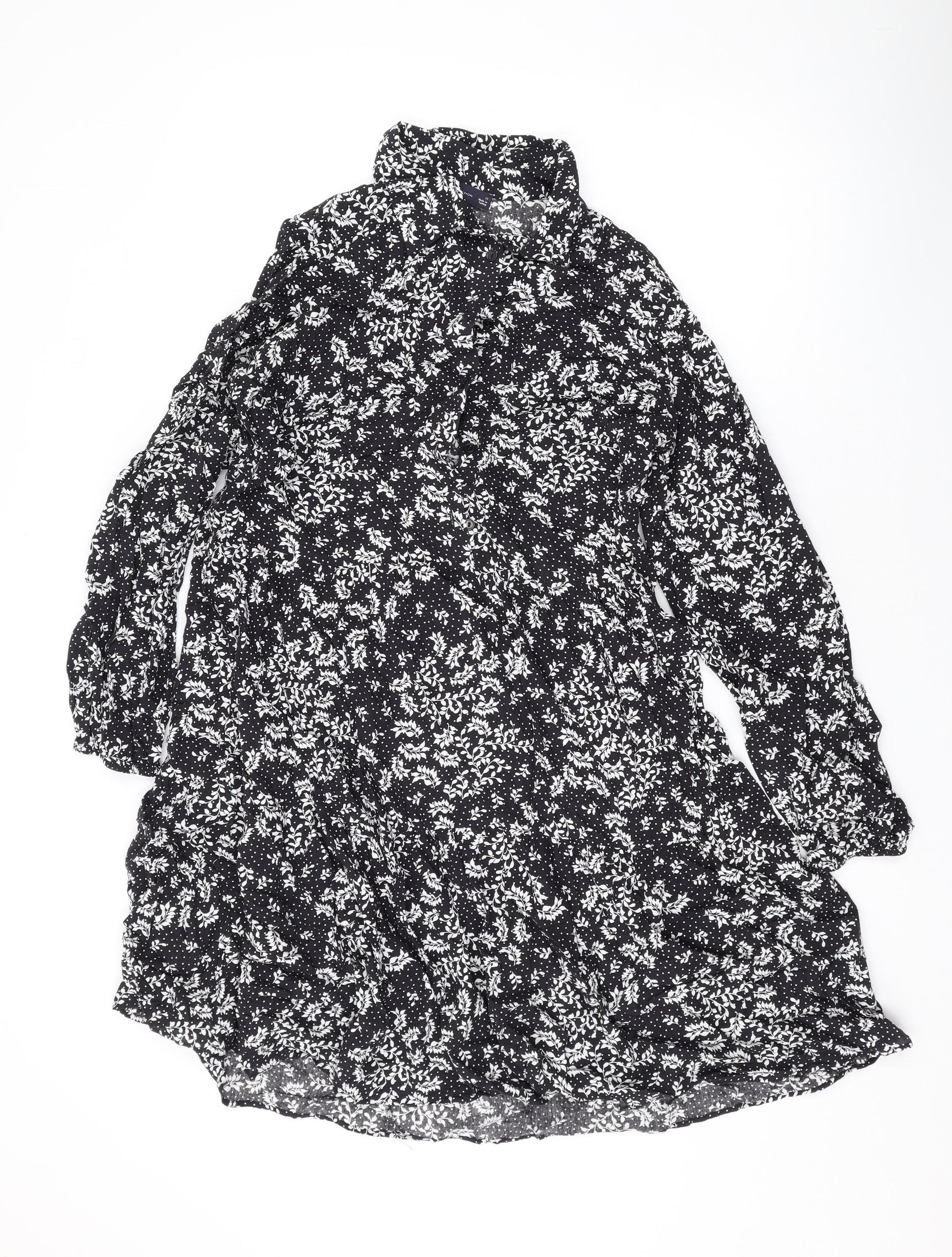 Womens Black Floral Viscose A-Line Size 12 Collared Button