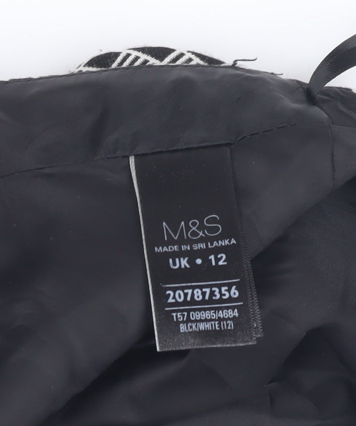 Elevate your wardrobe with this elegant Marks and Spencer Women's Black Geometric Pencil Skirt in size 12. Crafted from a luxurious blend of cotton, polyester, viscose, and elastane, this skirt ensures comfort and style. The sleek geometric pattern in a classic black shade adds a contemporary touch, perfect for both work and casual outings. With its zip accents and straight silhouette, it offers a flattering fit and ease of movement. Designed for regular size types, this machine washable skirt is a versatile addition to any fashion-forward wardrobe. Whether dressing up for a formal occasion or adding sophistication to your everyday ensemble, this pencil skirt is the perfect choice.