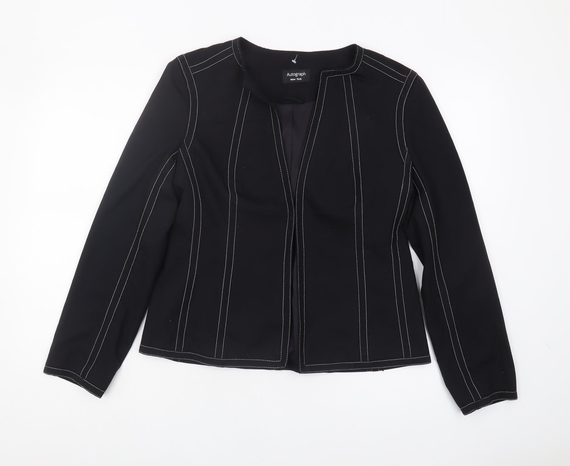 Elevate your wardrobe with this timeless black jacket from Marks and Spencer, perfect for adding a touch of elegance to any ensemble. Crafted for women in a size 14, this jacket is a versatile piece suitable for various occasions, from business meetings to casual outings. Constructed with high-quality wool and a hint of elastane, it offers both comfort and a flattering fit. The classic long sleeve design ensures it's ideal for cooler weather, while the sophisticated black hue makes it a staple piece that pairs effortlessly with any outfit.Indulge in the luxurious feel of the polyester and elastane lined interior that enhances comfort while maintaining a sleek silhouette. This jacket is a statement of sophistication and practicality, designed to keep you warm and stylish. Although pre-owned, it remains in excellent condition, showcasing no visible defects, ensuring you receive a high-quality garment that will last you for seasons to come. Perfect for the modern woman who enjoys a seamless blend of fashion and function.Whether you're heading to the office or enjoying a night out, this jacket promises to be a chic addition to your closet. Experience the trusted quality of Marks and Spencer with this essential wardrobe staple, offering a timeless design that transcends seasons.